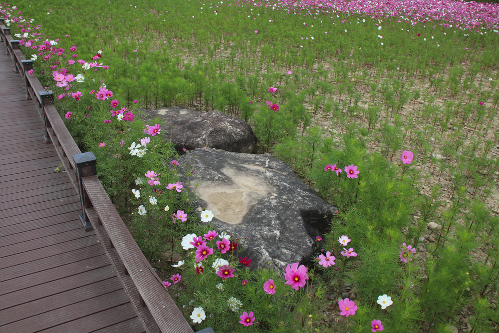 꽃만 있는 게 아니라 바위가 있어 더욱 좋아 보이는 코스모스 밭입니다.