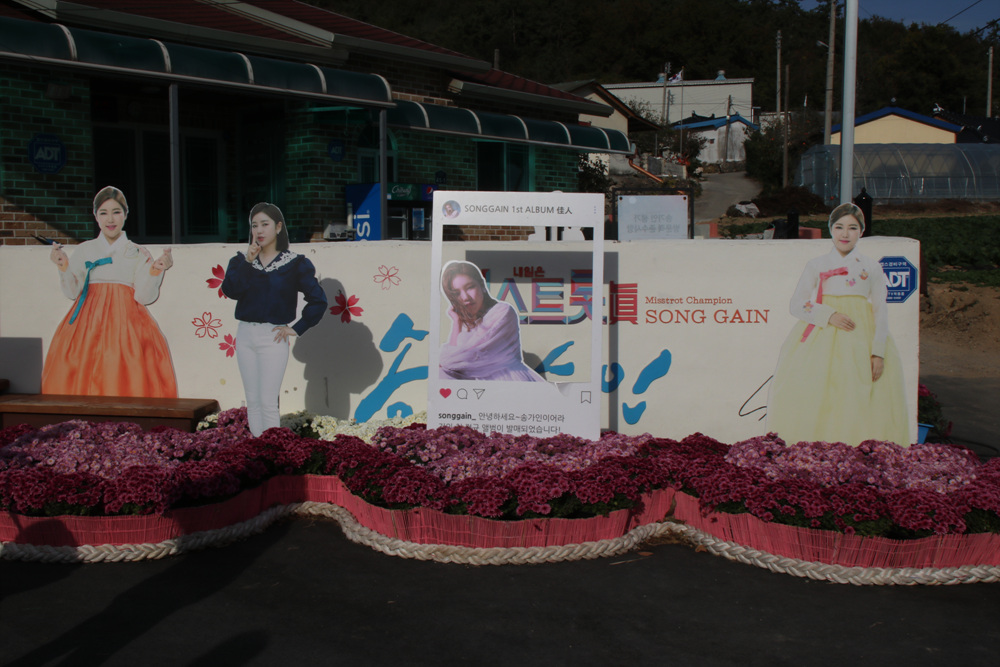 마을 입구에 송가인 사진과 함게 사진을 찍을 수 있는 공간을 마련해 두어