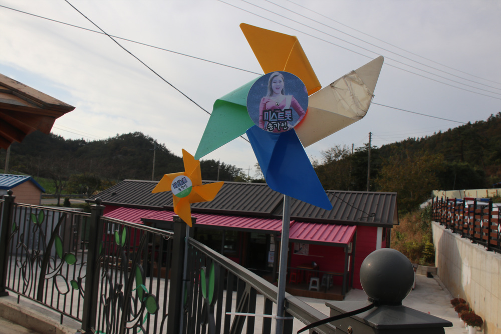 가게 입구에는 송가인 바람개비가 장식되어 있으며