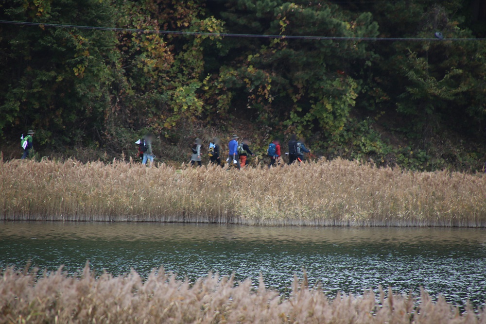 씩씩하게 걸어 나가는 산악인 엄홍길 대장과 함께 하는 평창 평화봉에서 DMZ까지' 걷기 행사 참가자들의 모습이 보기에 좋습니다.
