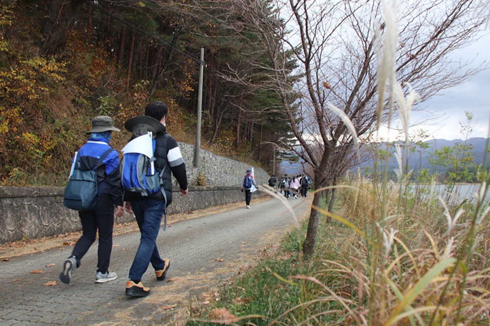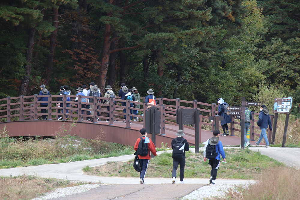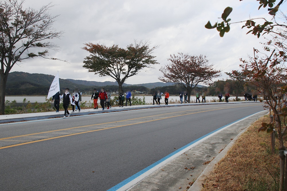 길을 걸어가는 걷기 행사 참가자들의 발걸음은 힘찹니다.