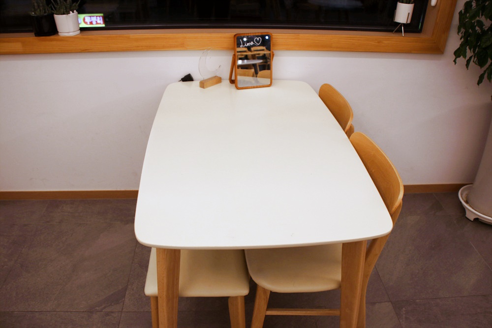 테이블 위에 작은 스탠드 거울과 반달 모양 조명도 구비하여 놓았습니다.