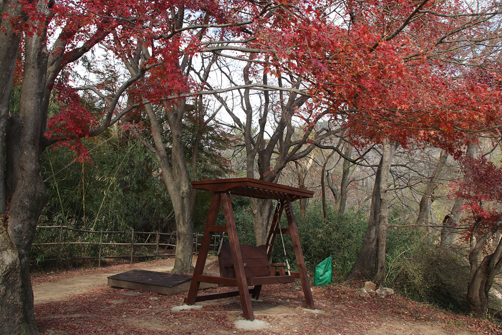 그 아래 흔들 그네는 빈 의자가 되어 이 단풍 아래에서 아름다운 사랑을 나눌 연인을 기다리고 있는 것처럼 보입니다.
