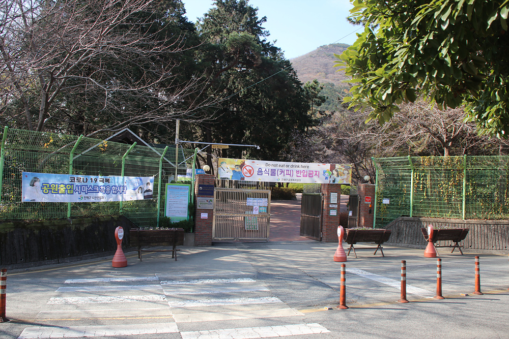 진해 내수면 환경생태공원 입구에는 마스크 착용 그리고 음식물 반입금지 현수막이