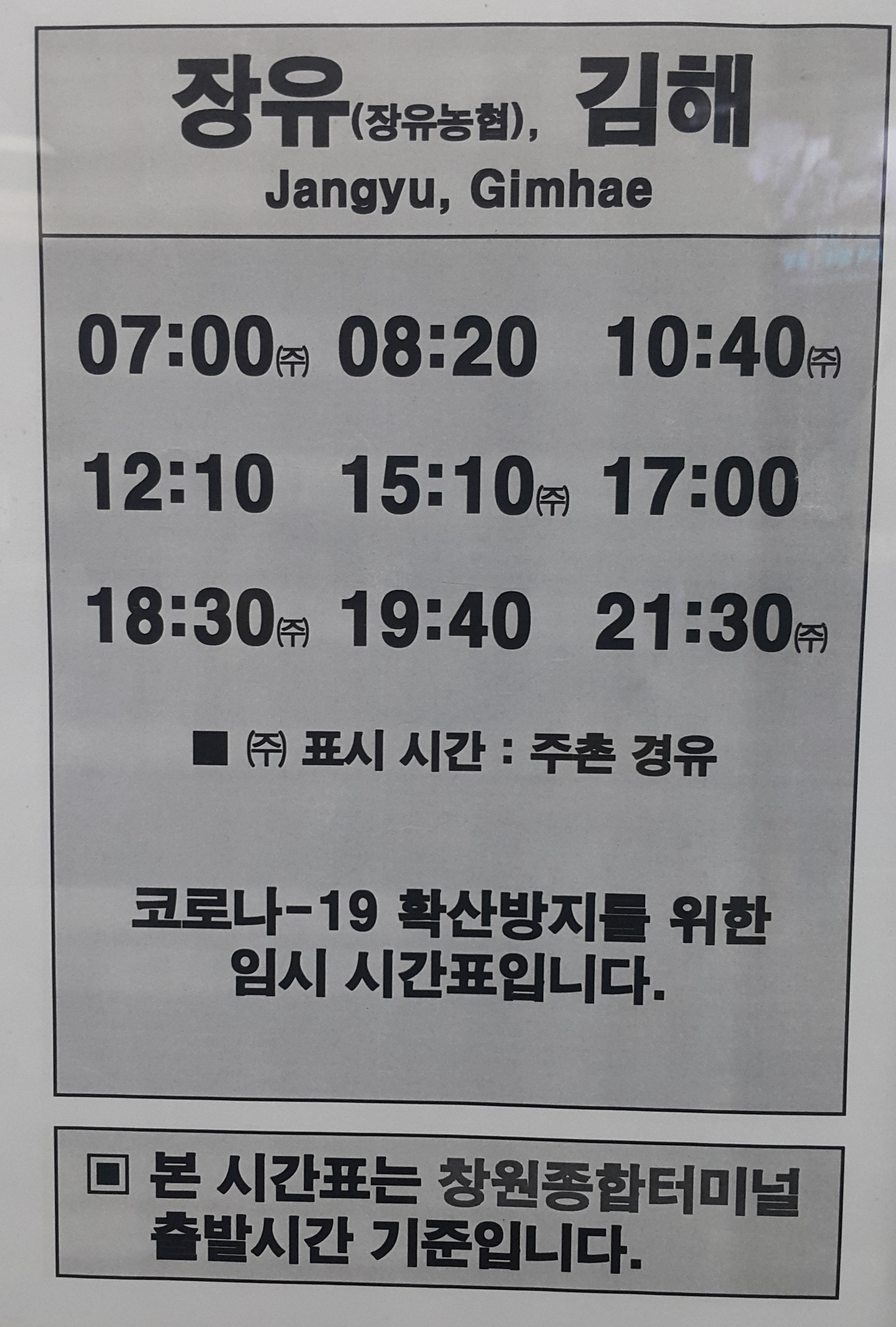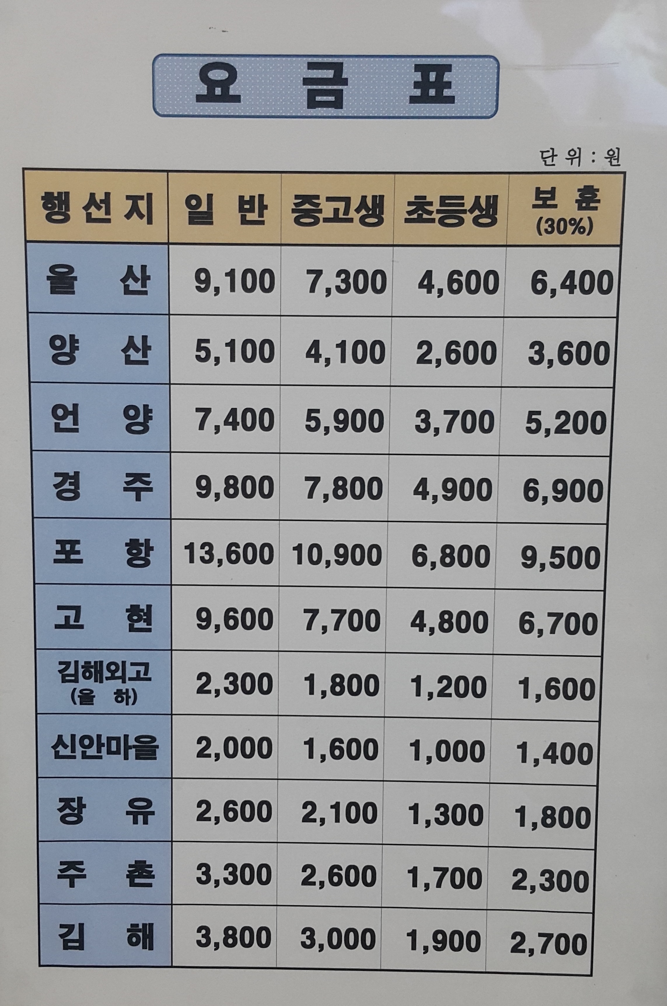 창원 남산버스정류장 출발 요금표