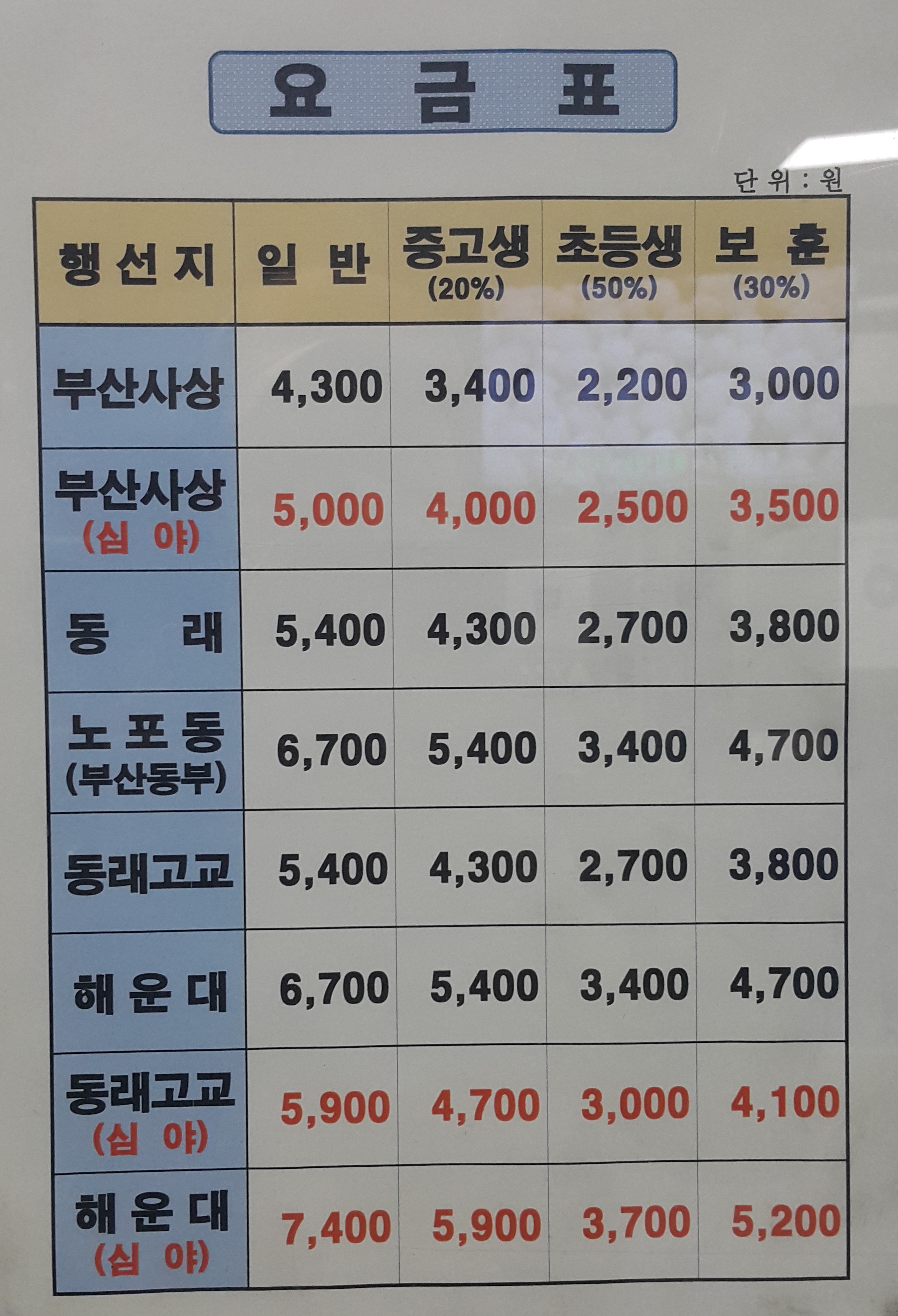 창원 남산버스정류장 출발 요금표