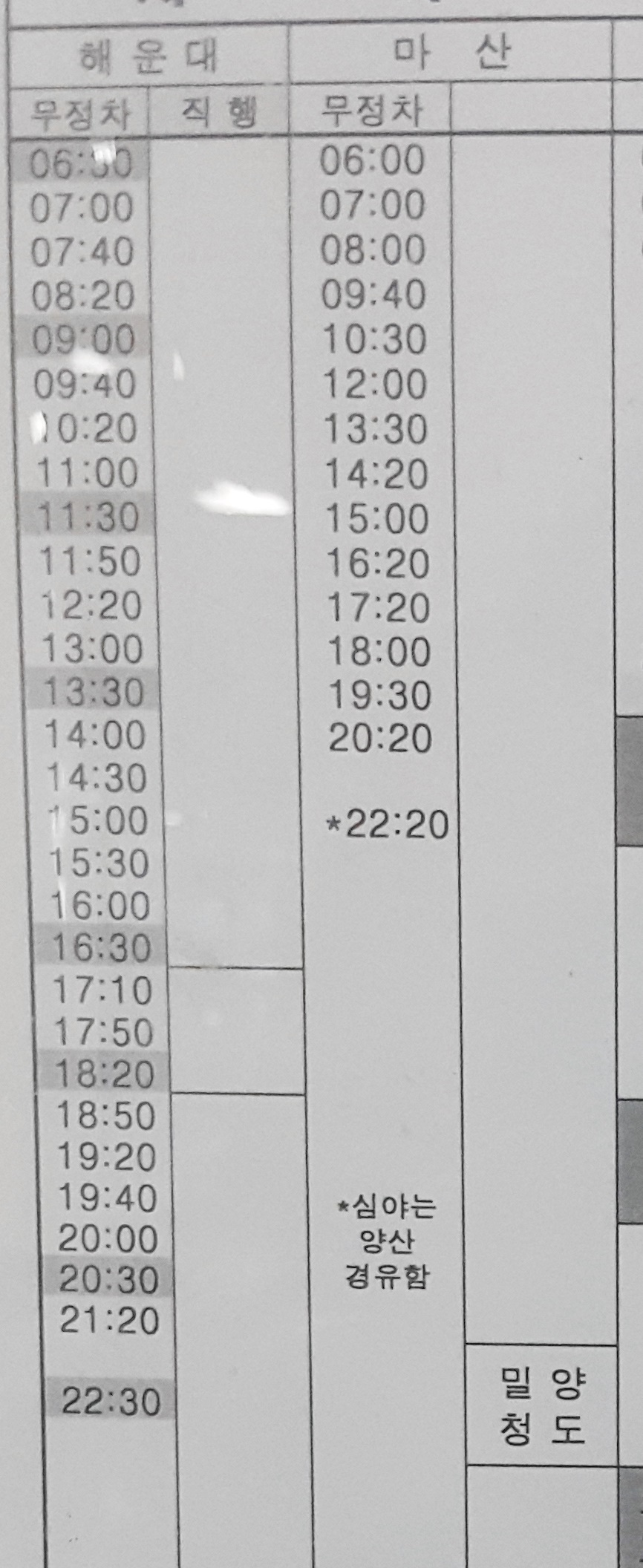 울산 출발 양산, 김해, 동대구, 대구서부, 영대, 경산, 청주 방면.