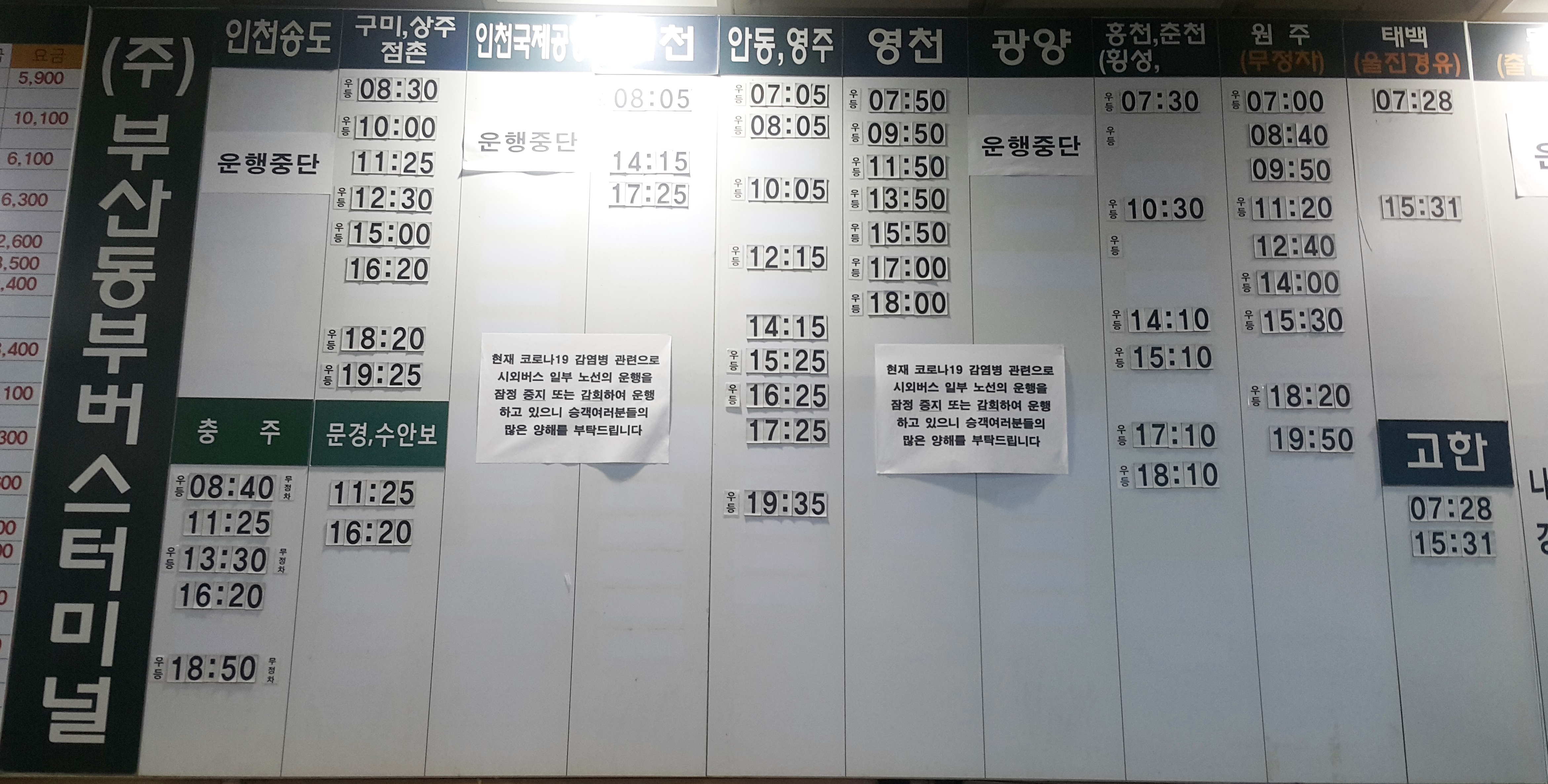 부산 동부 노포 출발 동해, 삼척, 동해, 강릉, 속초, 포항, 울진, 거진, 오산, 수원, 안산 방면.