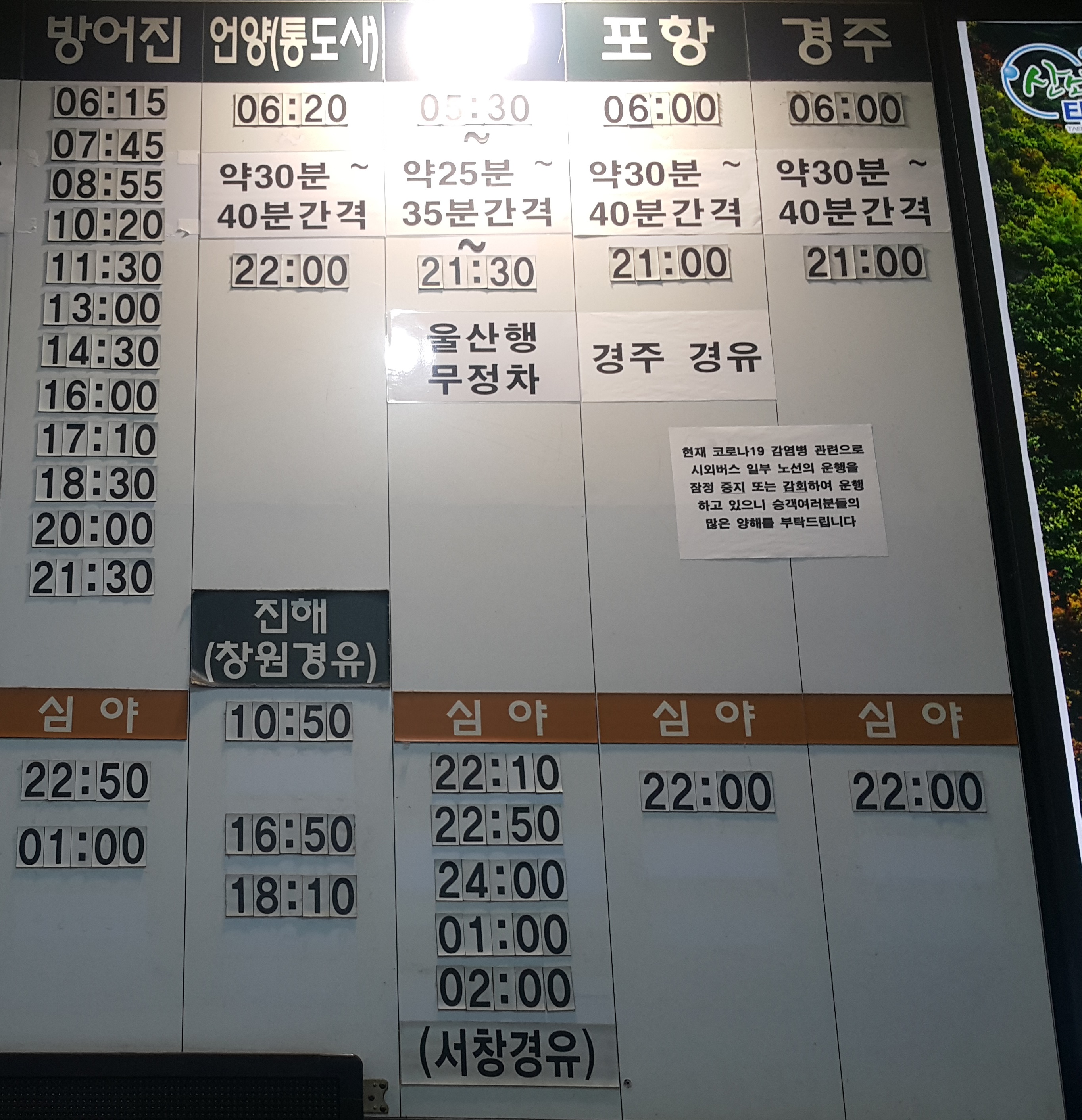 부산 노포 동부 출발 방어진, 언양, 통도사, 진해, 창원, 울산, 포항, 경주 방면.