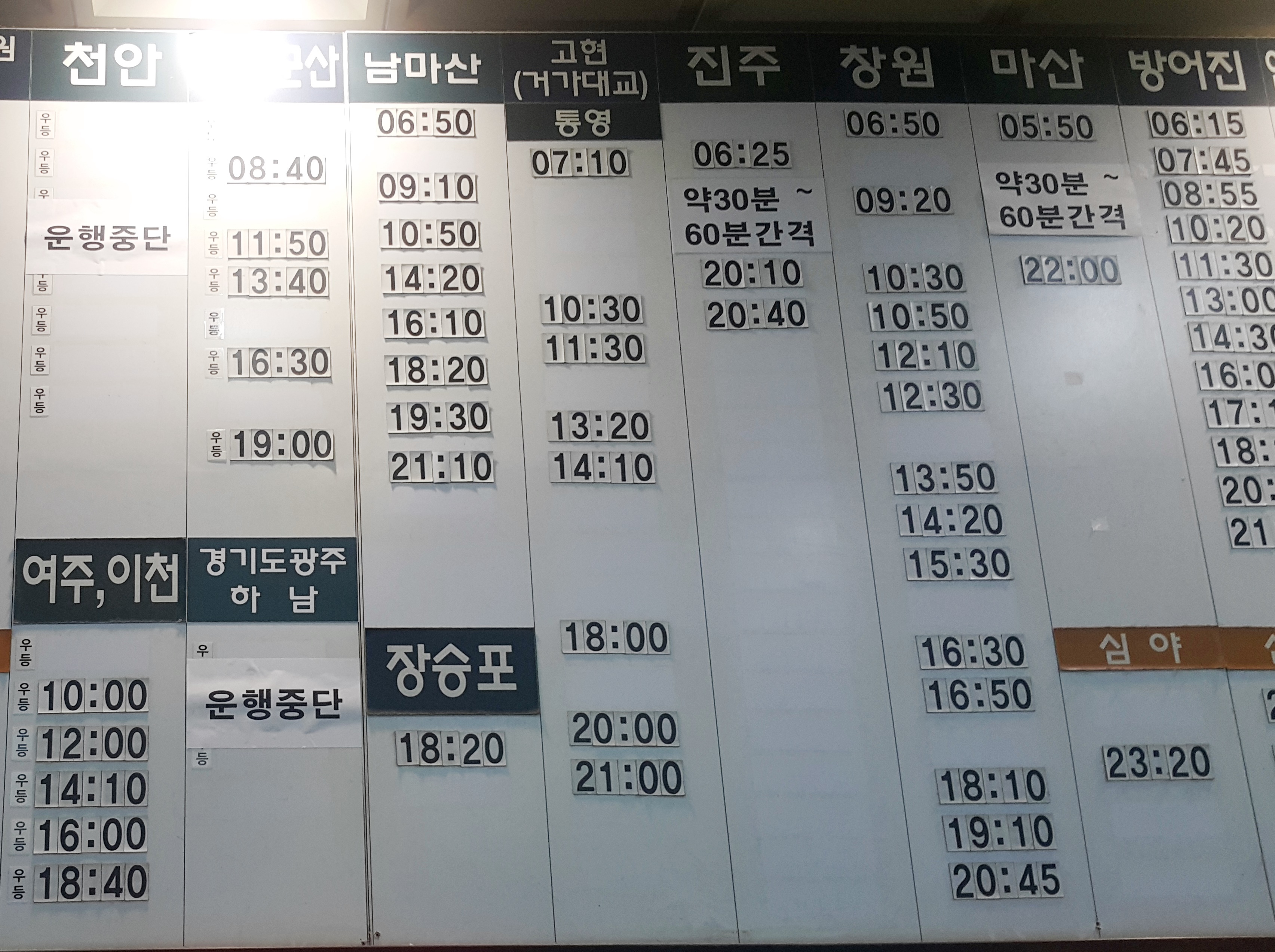 부산 노포 동부 출발 익산, 군산, 여주, 이천, 남마산, 장승포, 고현, 통영, 진주, 창원, 마산 방면.