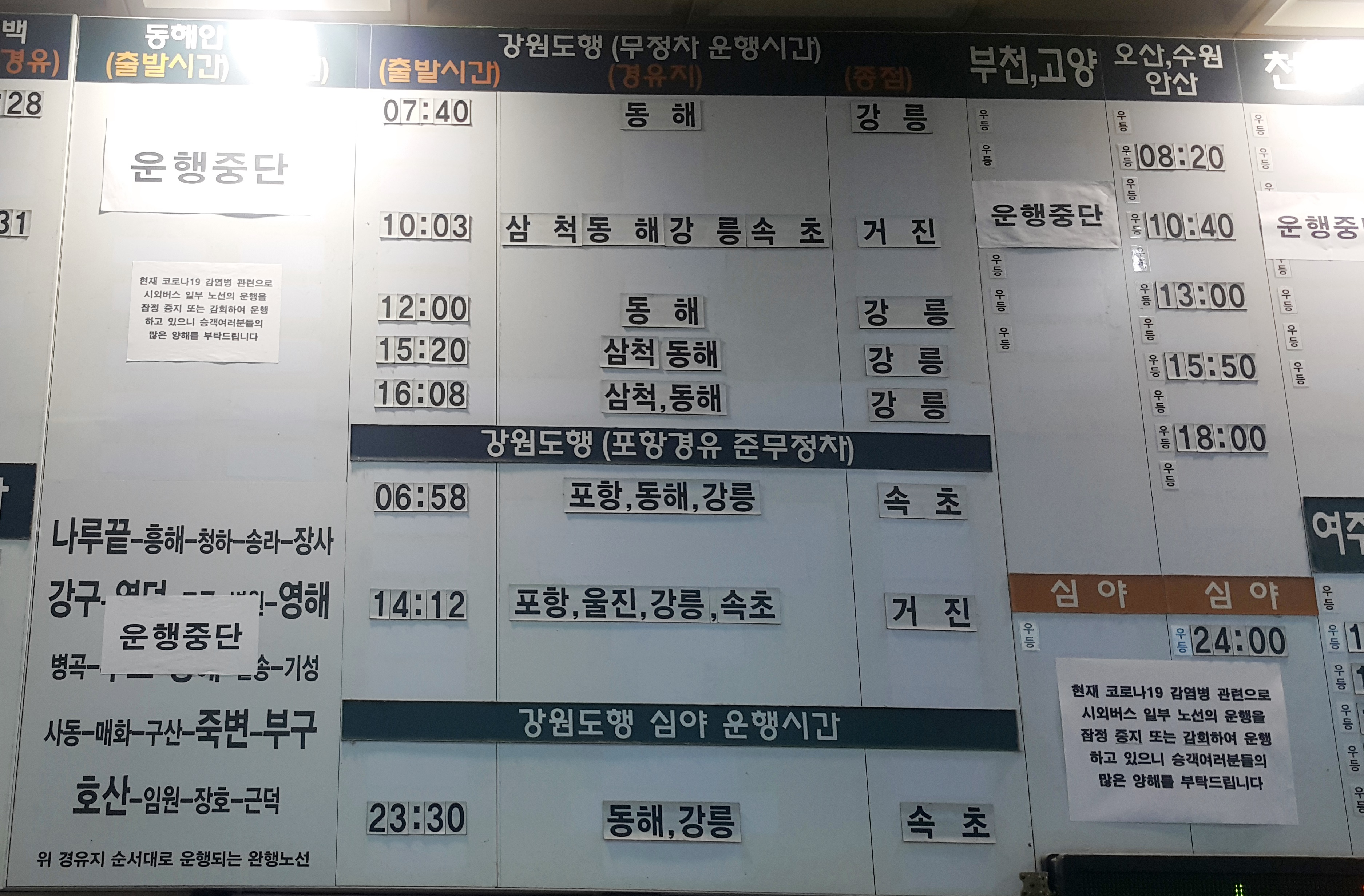부산 동부 노포 출발 동해, 삼척, 동해, 강릉, 속초, 포항, 울진, 거진, 오산, 수원, 안산 방면.