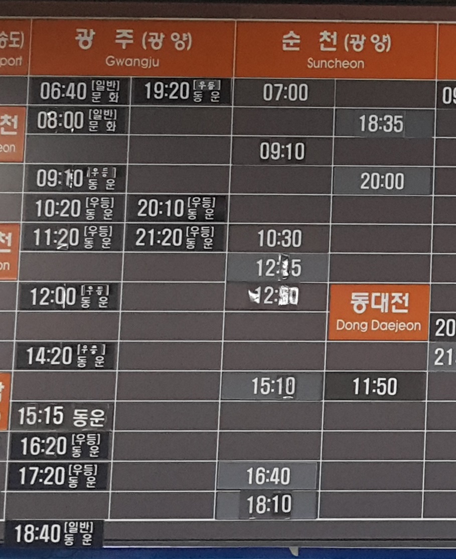동광양 출발 광주, 순천, 동대전, 광양 방면.