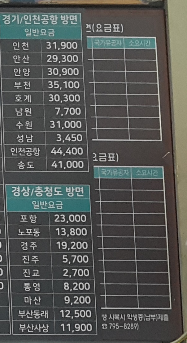 동광양시외버스터미널 요금표 중마버스터미널 요금표