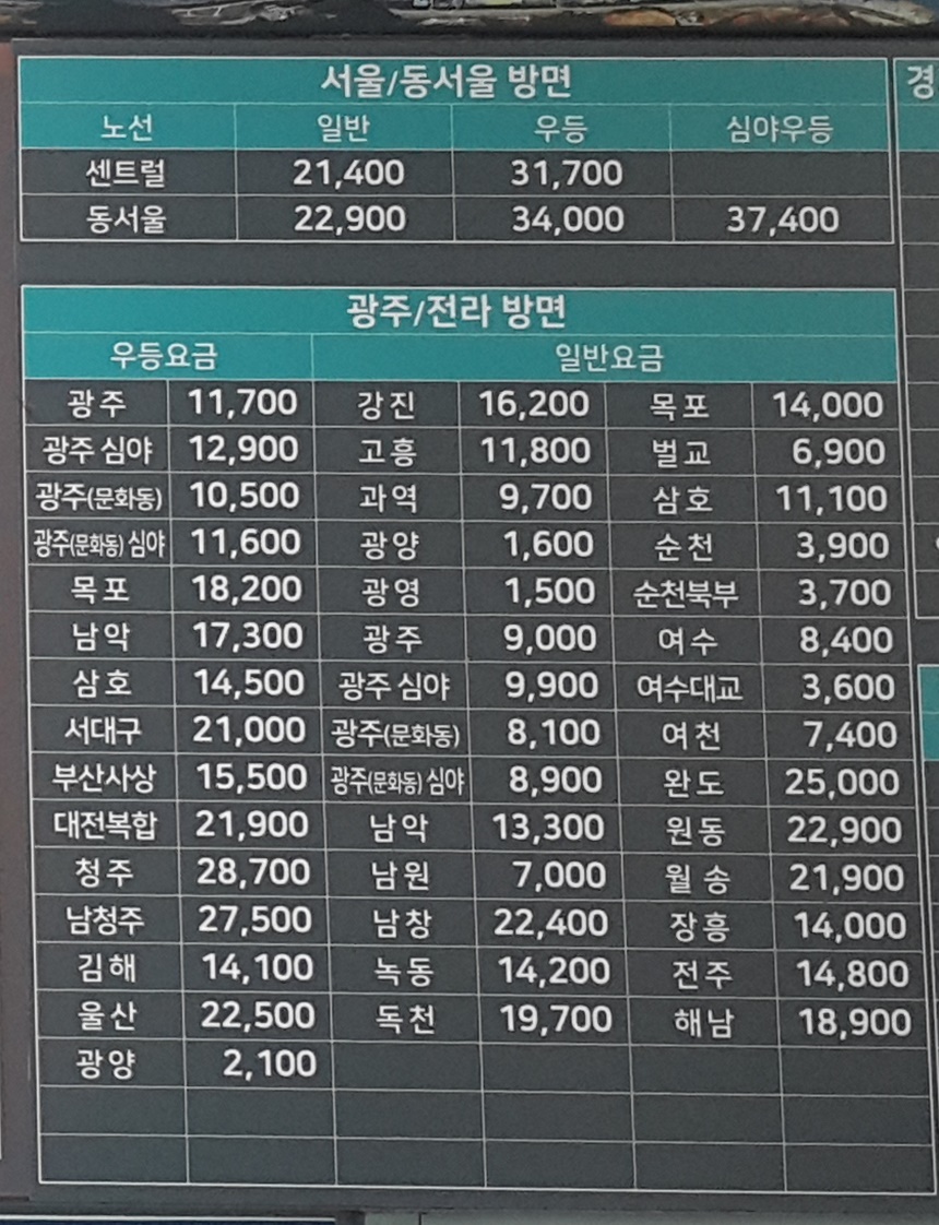 동광양시외버스터미널 요금표 중마버스터미널 요금표