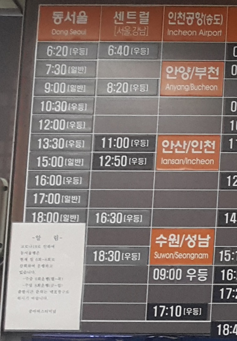 동광양 출발 동서울, 센트럴 서울 강남, 수원, 성남 방면.