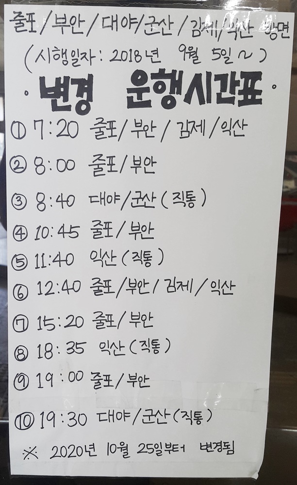 고창시외버스터미널 출발 줄포, 부안, 대야, 군산, 김제, 익산 방면.