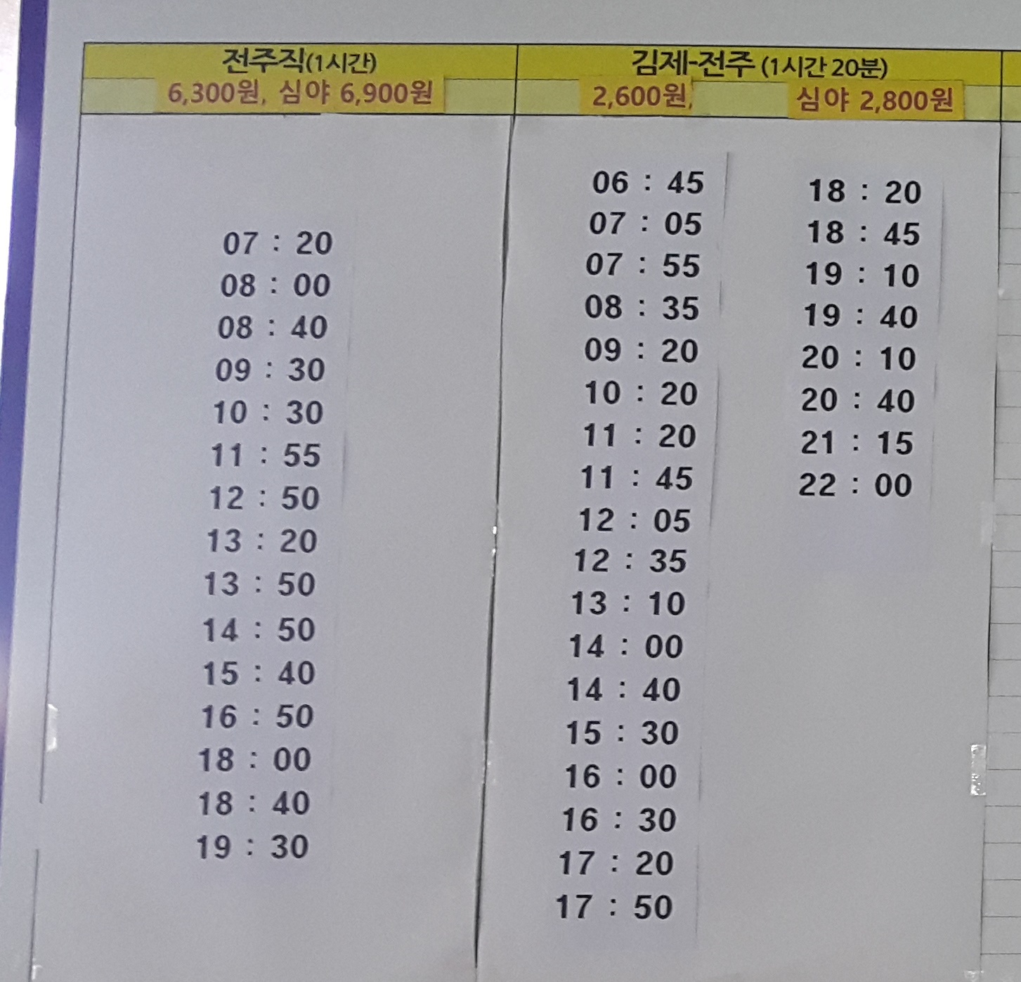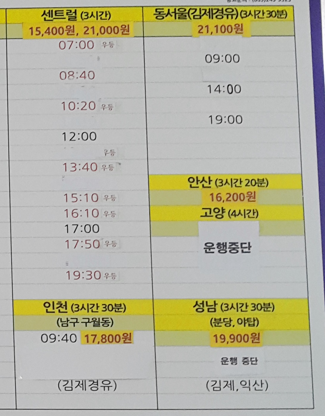 부안 출발 센트럴, 동서울(김제경유), 인천, 방면.