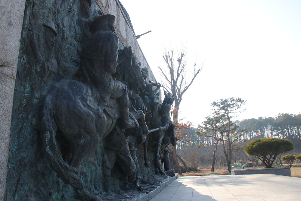 정면의 계단으로 올라가면 죽창 모형의 아래에는 당시의 전투 장면이 부조되어 있는데요,