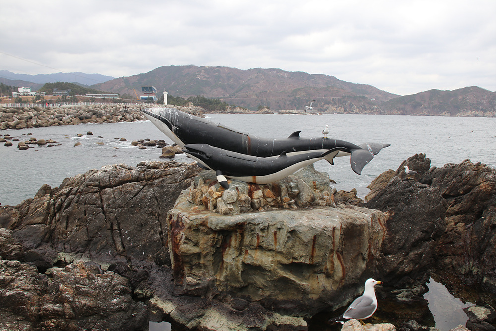 고래조형물이 있는데 고래도 살매기들의 변벼락은 피하지 못하고 검은몸이 하얓게 변하고 있습니다.