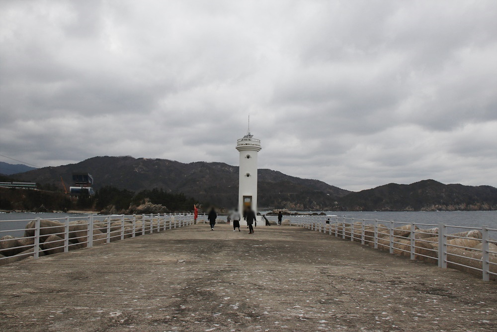 장호항 주변으로는 횟집들이 즐비하며 그 횟집을 지나가면 장호항 방파제의 등대가