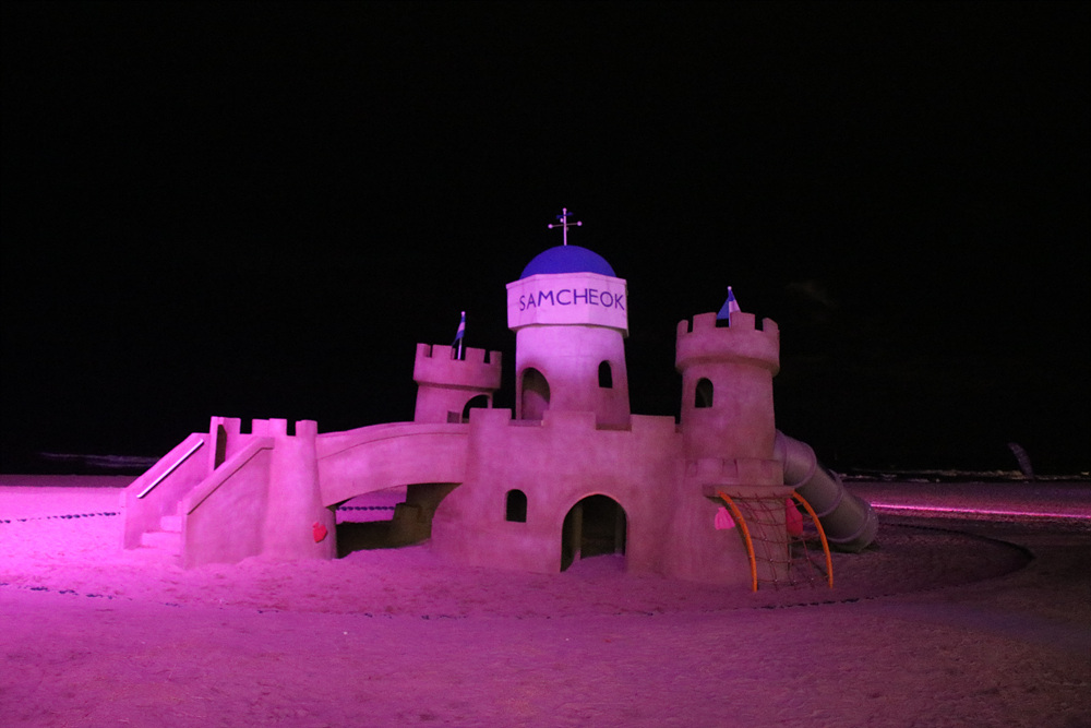 해변의 원두막을 비롯한 조형물들이 빛을 반사하여 더욱더 아름다운 삼척해수욕장의 야경을 만들어 냅니다.