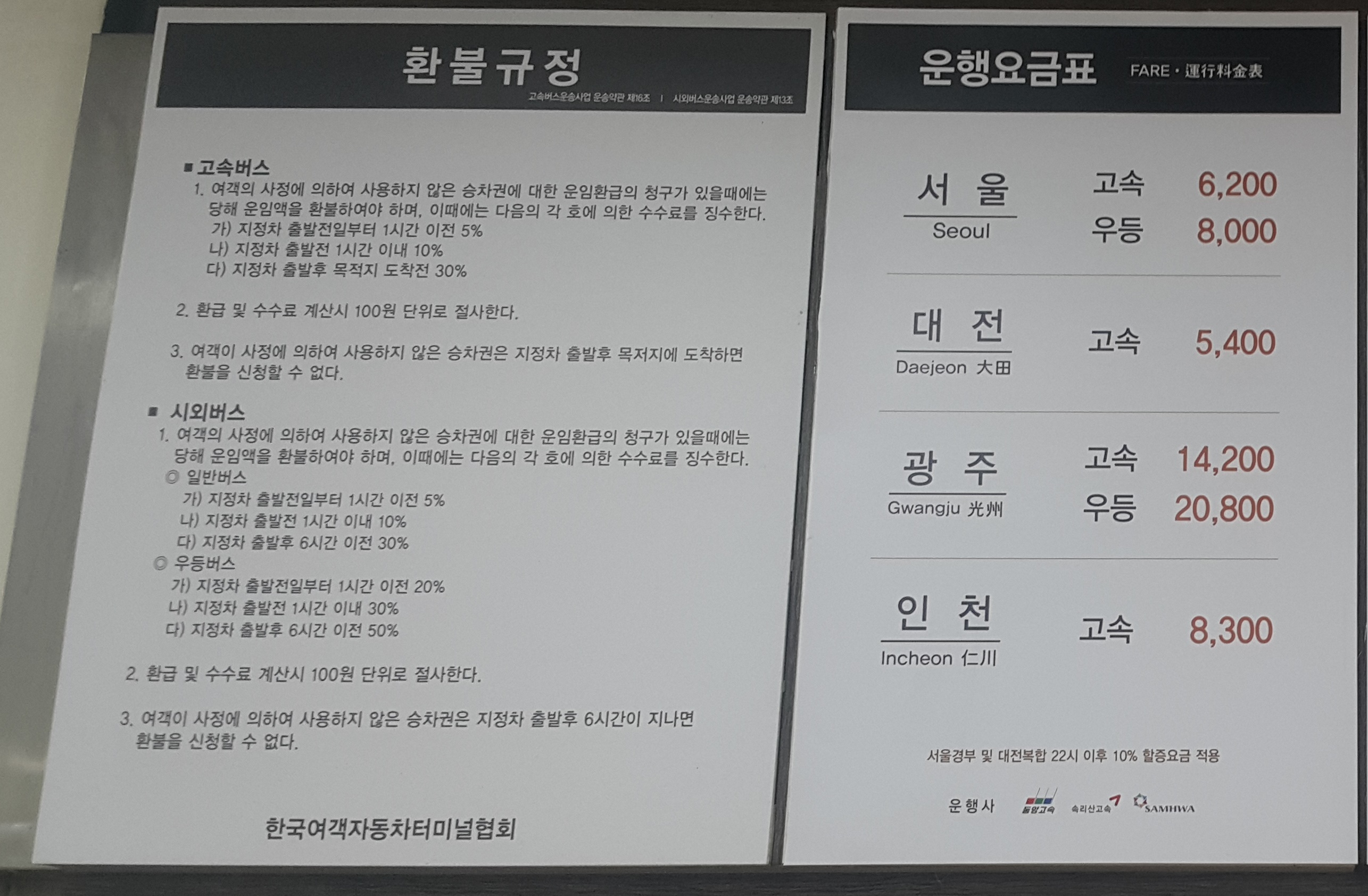 천안고속버스터미널 운행요금표