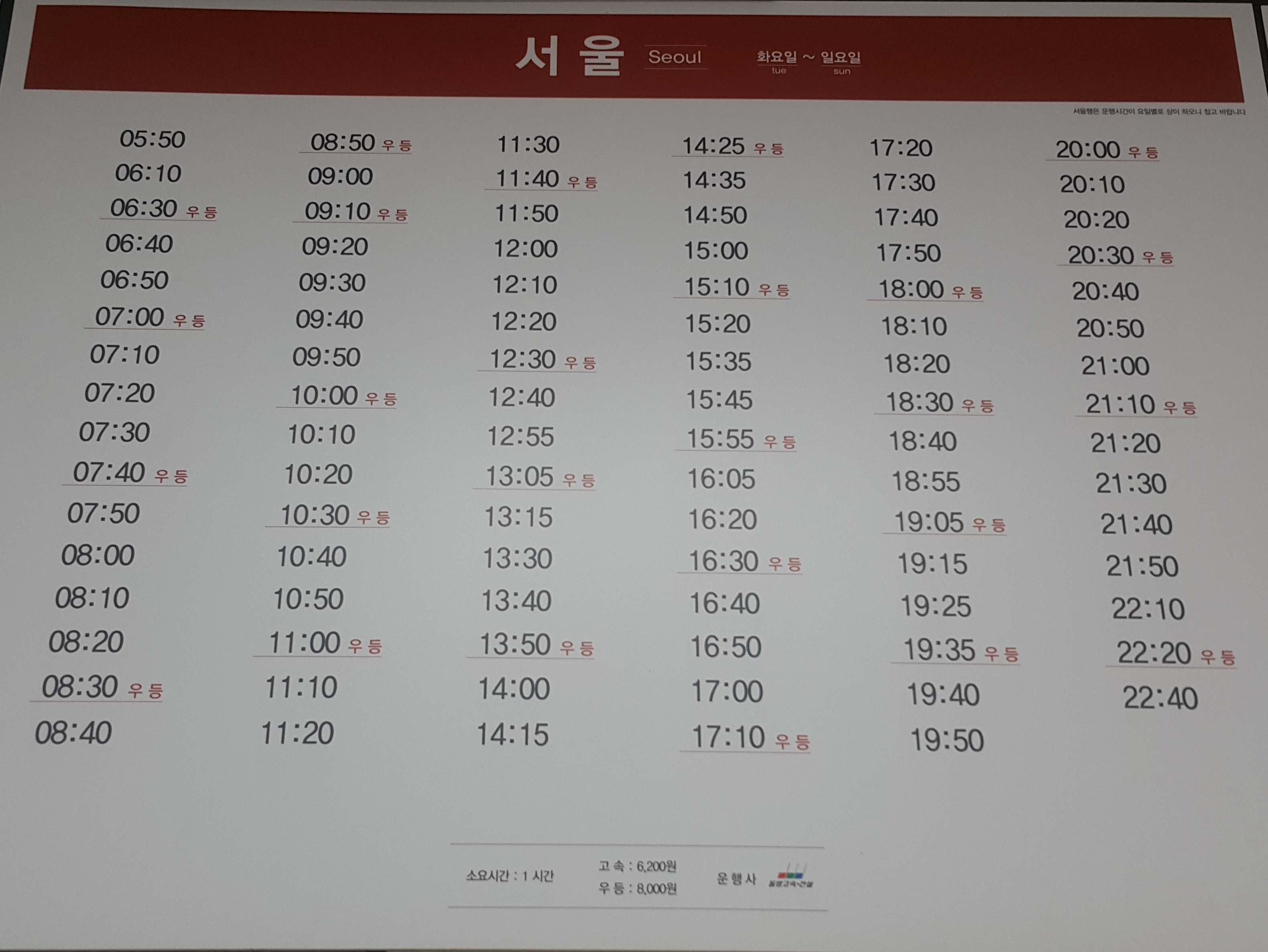 천안 출발 서울 방면 화요일~일요일 시간표