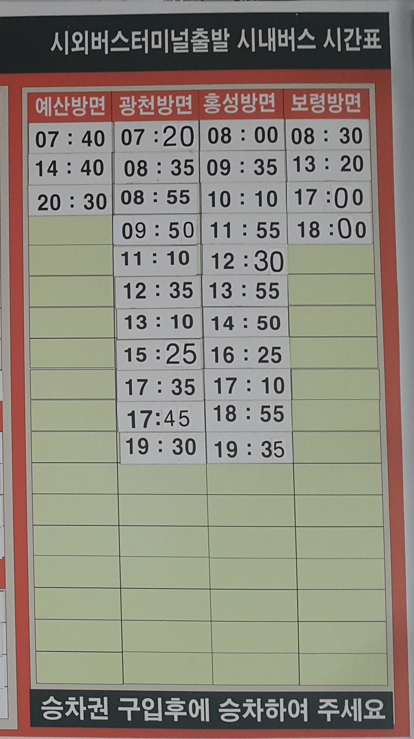 청양시외버스터미널 시내버스 시간표 예산, 보령, 홍성, 광천 방면.