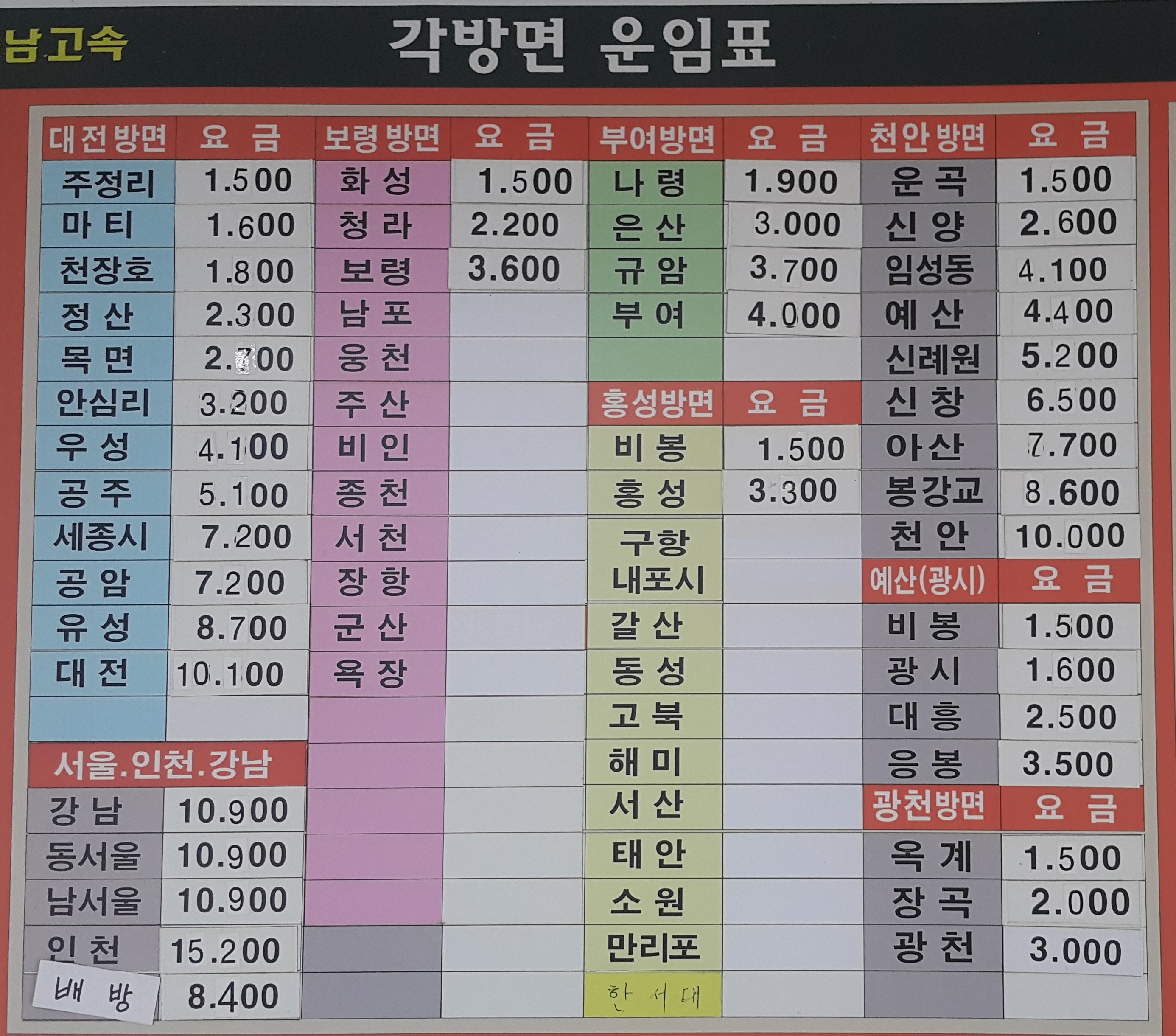 청양 출발 강남센트럴씨티, 인천, 예산 방면.