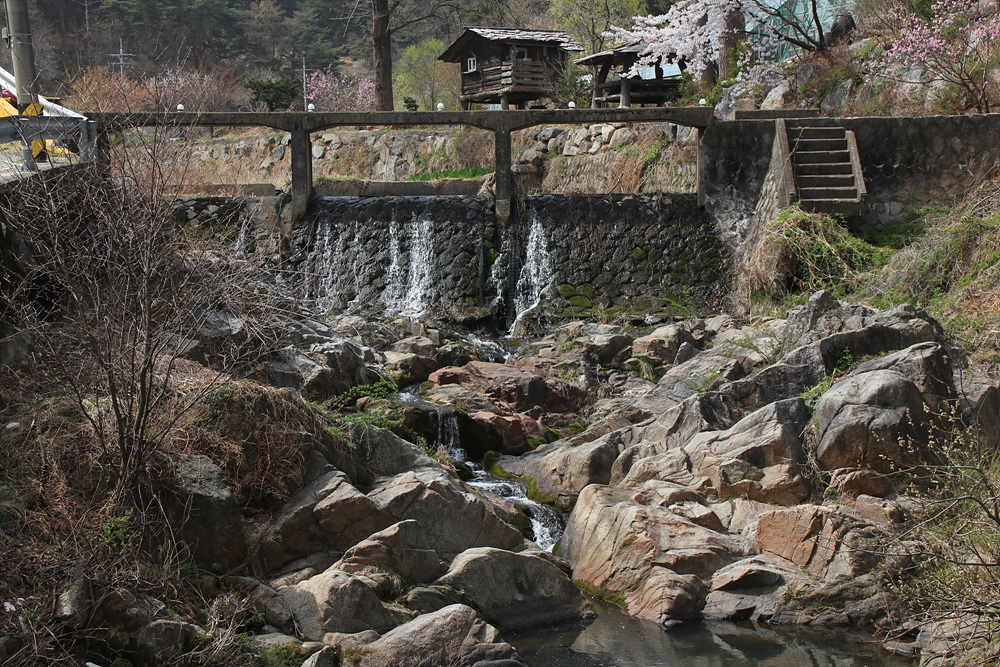 계곡에 흐르는 물과 식당 건물의 모습 그리고 계곡을 가로지르는 수로가 하나가 되어서