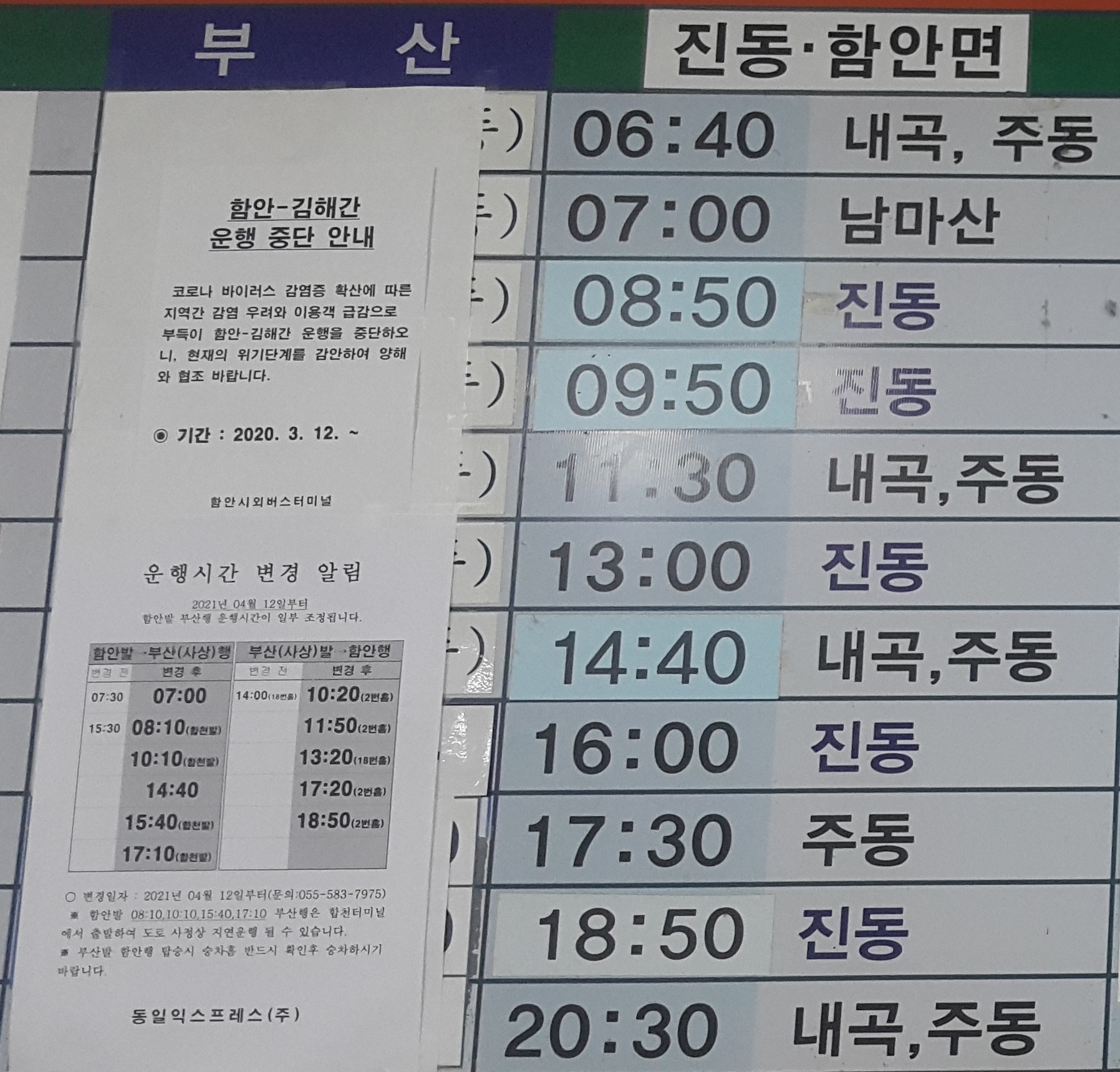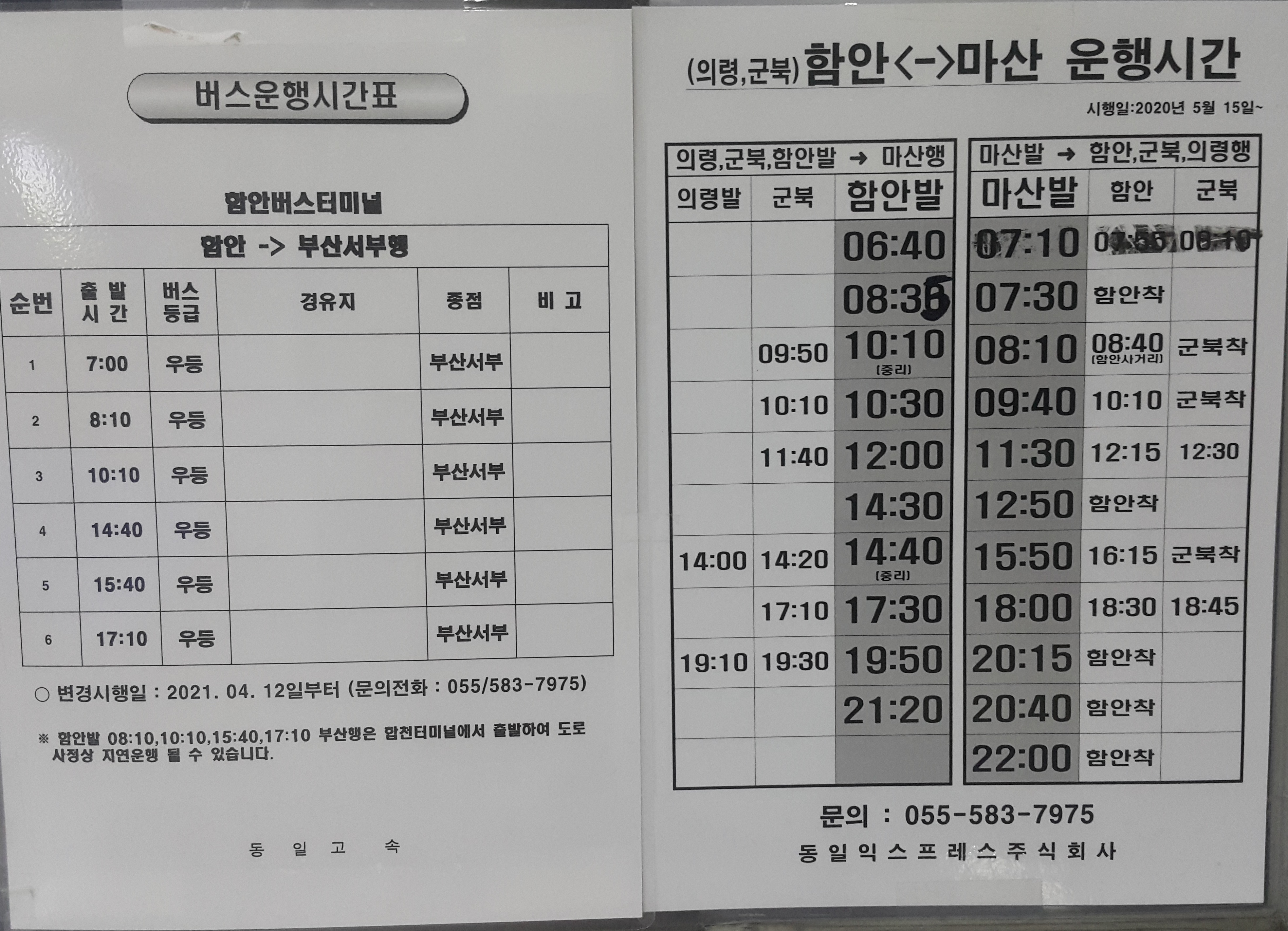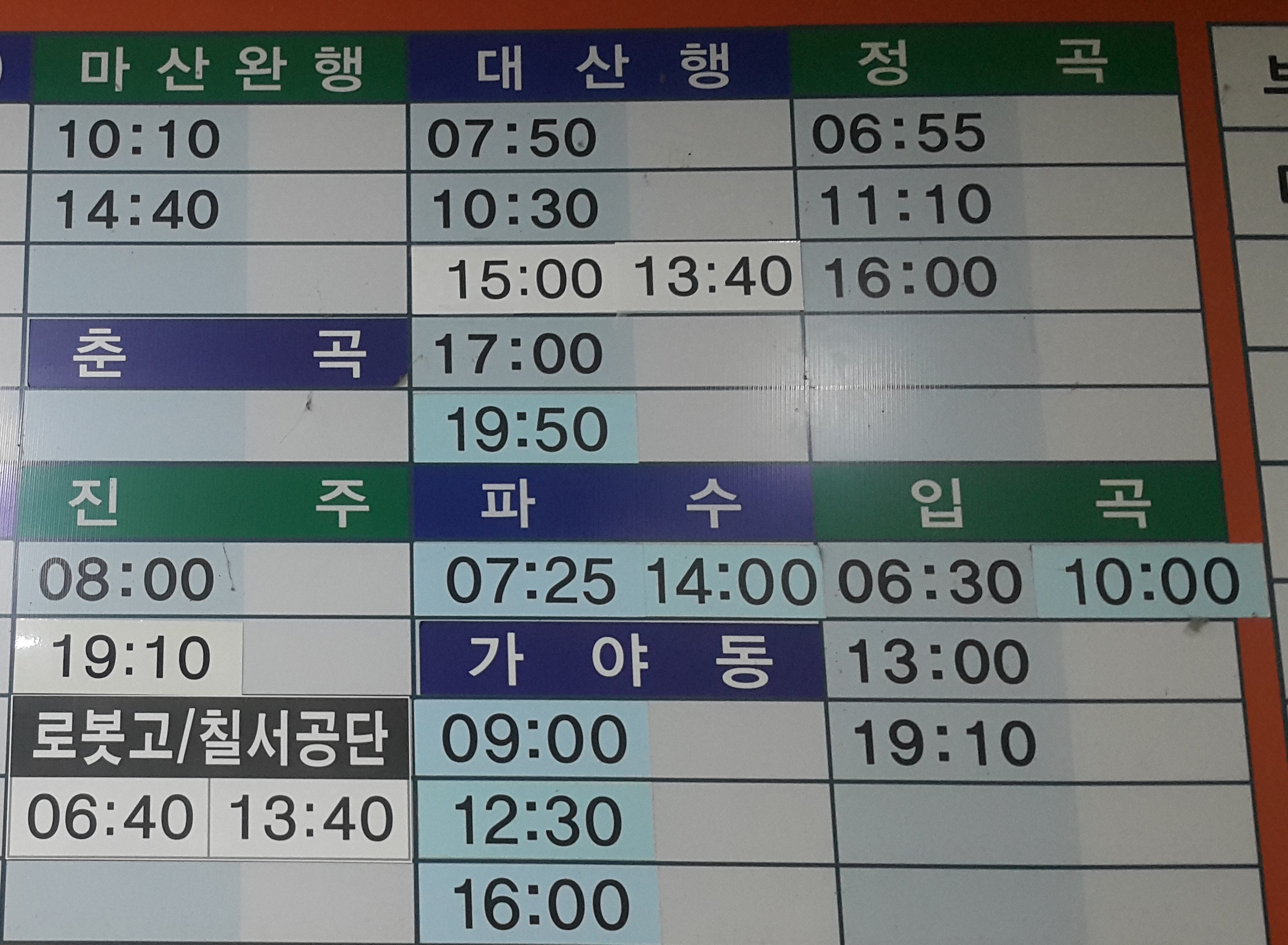 함안 출발 마산, 춘곡, 대산, 정곡,파수, 입곡, 가야동 방면.