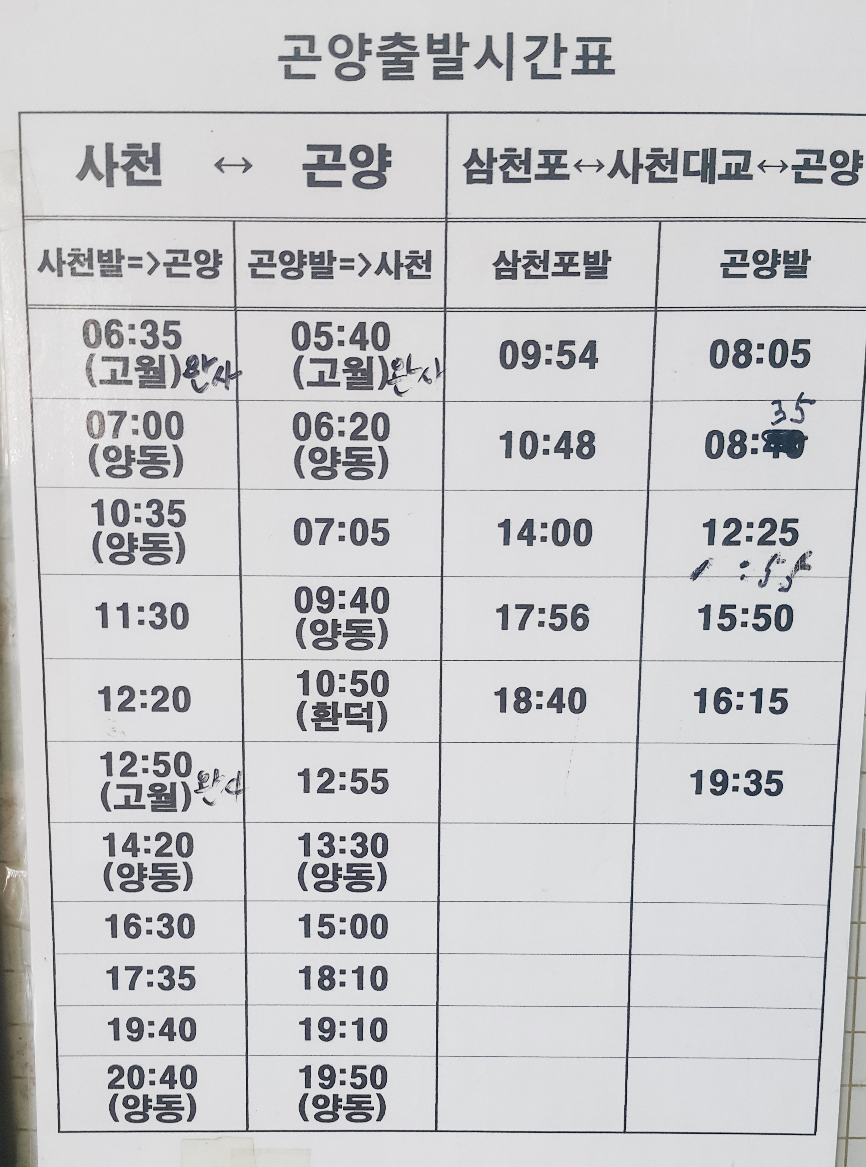 곤양 출발 부산, 진주, 마산, 창원, 하동, 진교, 남해, 서포, 옥종, 완사 방면.