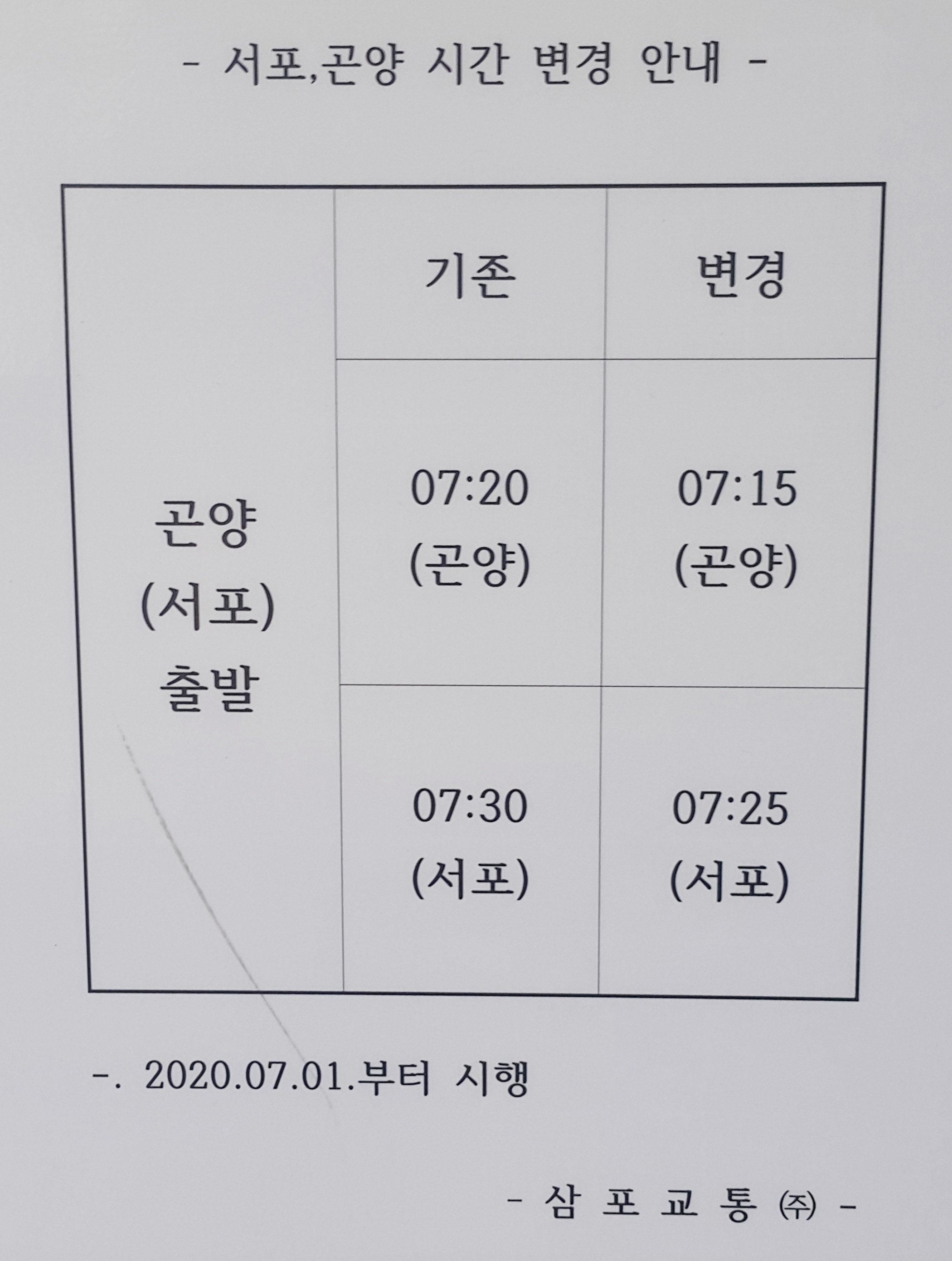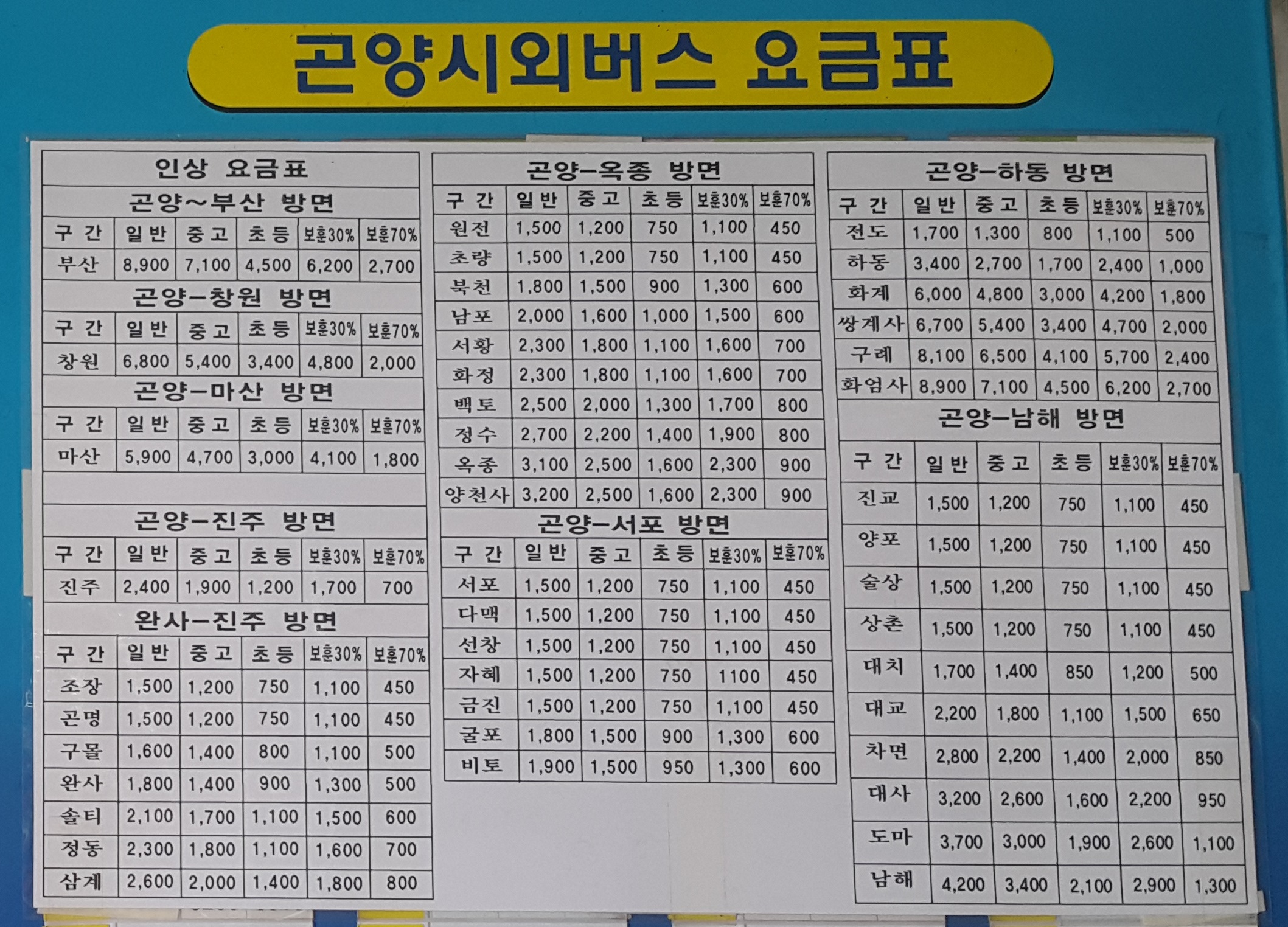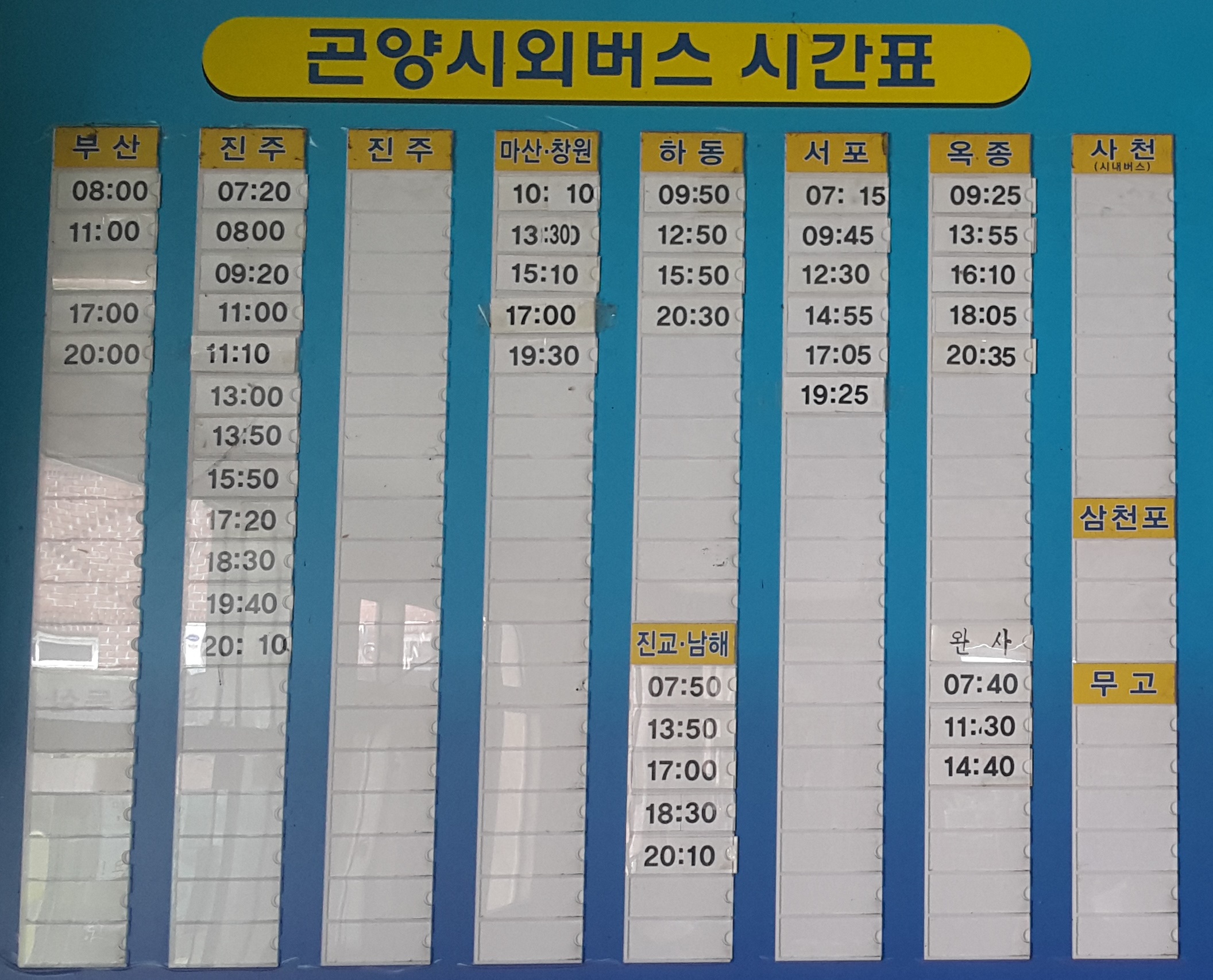 곤양 출발 부산, 진주, 마산, 창원, 하동, 진교, 남해, 서포, 옥종, 완사 방면.