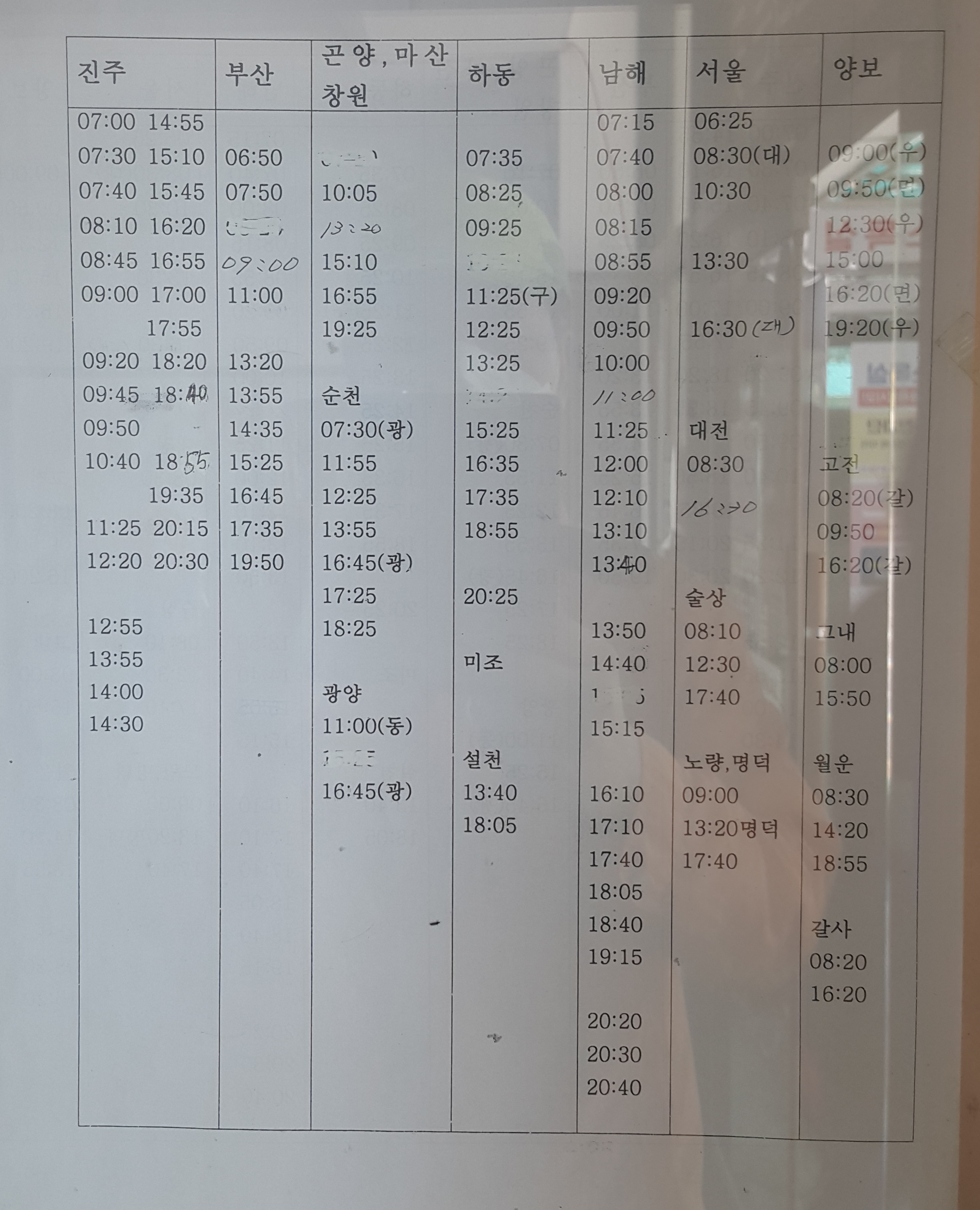 진교 출발 진주, 부산, 곤양, 마산, 창원, 하동, 남해, 서울, 양보, 순천, 광양, 미조, 설천, 대전, 술상, 노량, 명덕, 고전, 고내, 월운, 갈사 방면