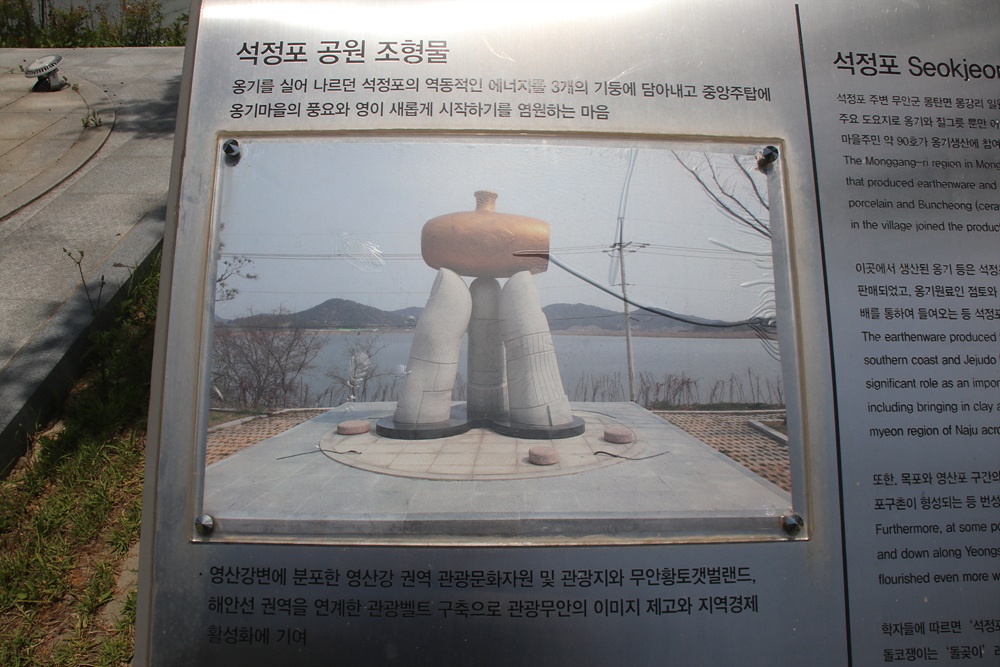 안내판에 따르면 용기를 실어 나르던 석정포의 역동적인 에너지를 3개의 기둥에 담아내고
