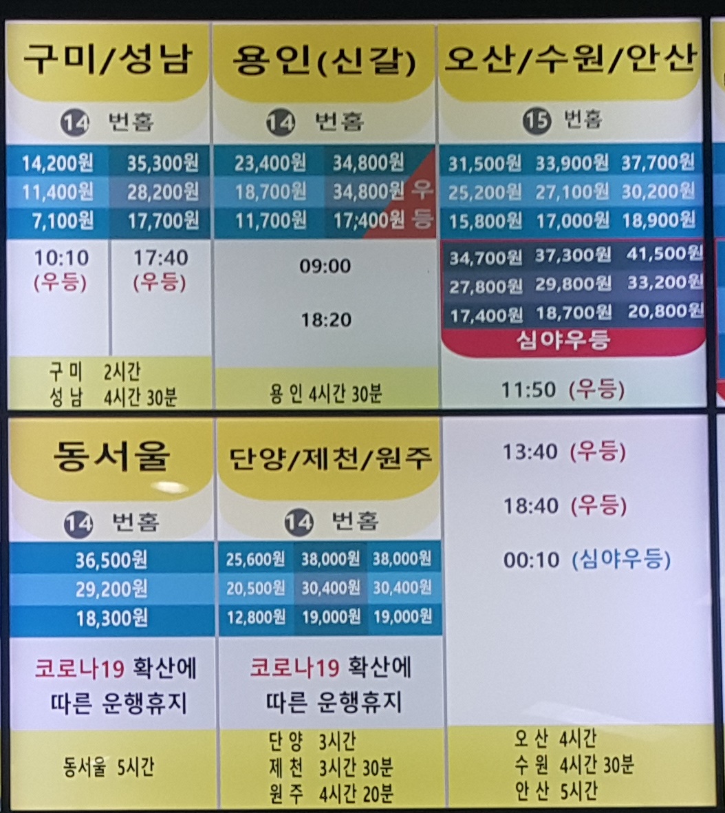 14번홈 구미, 성남, 용인, 신갈, 동서울, 단양, 제천, 원주 방면.