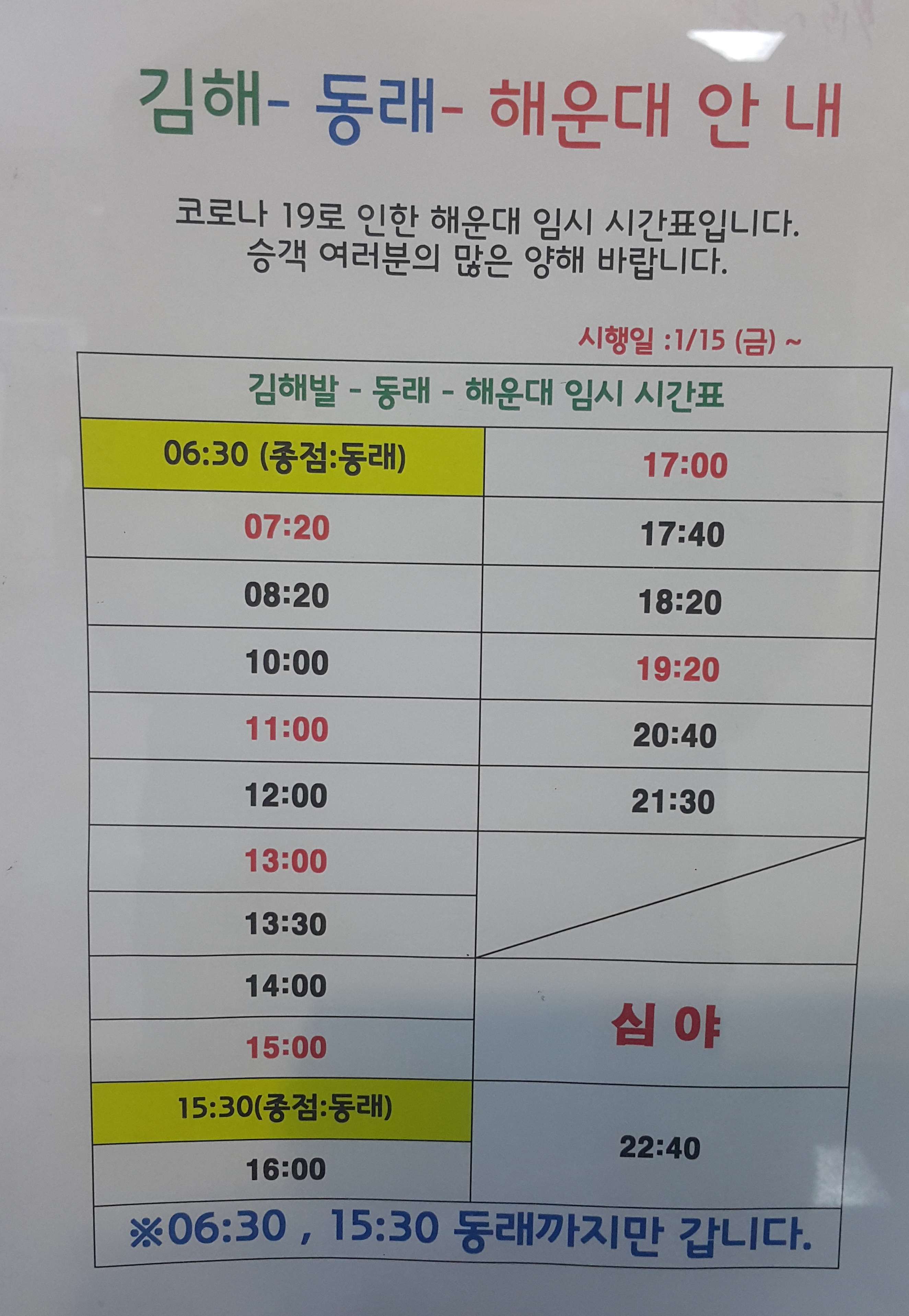김해시외버스터미널 출발 동래, 해운대 방면 시간표.