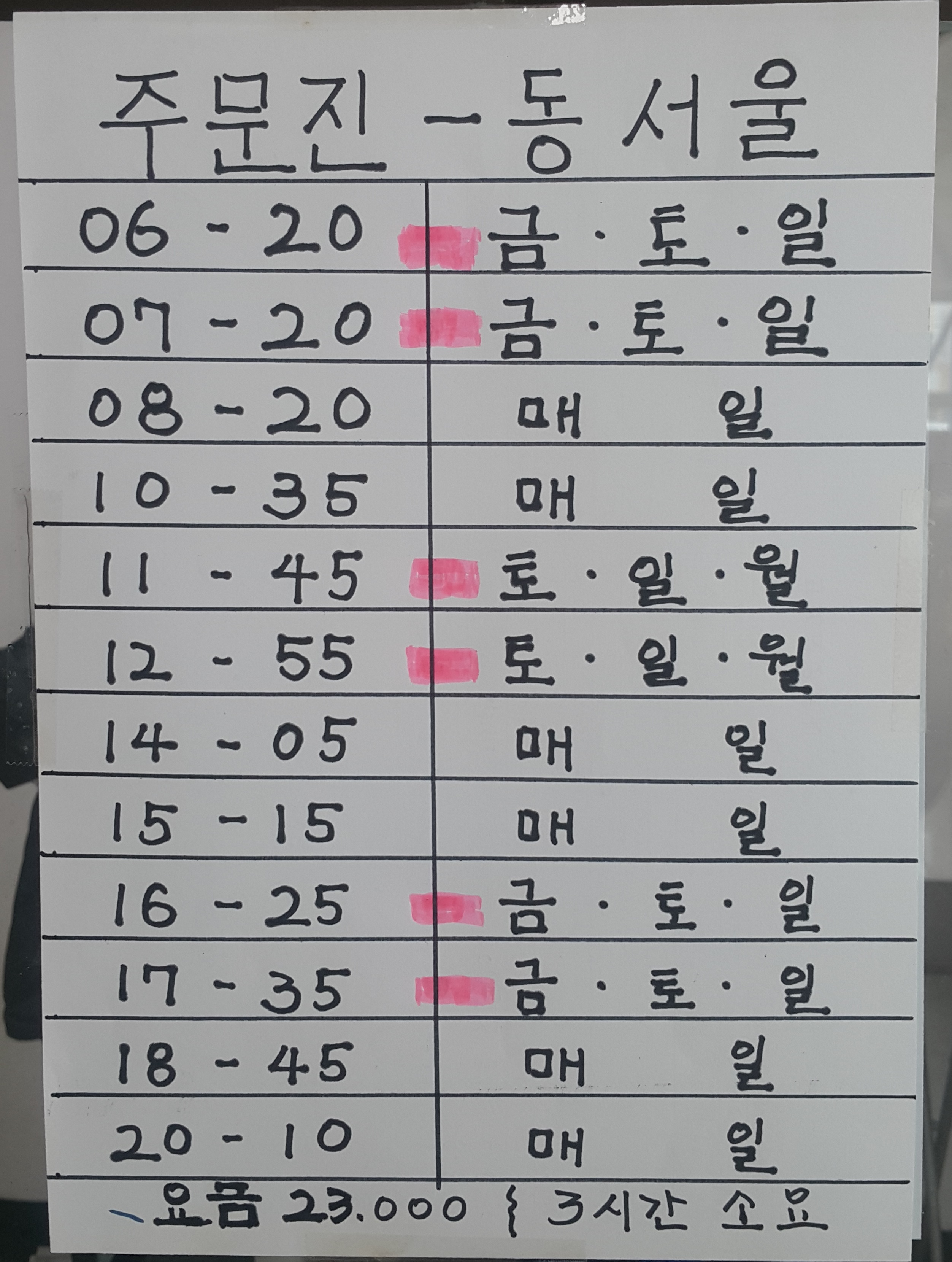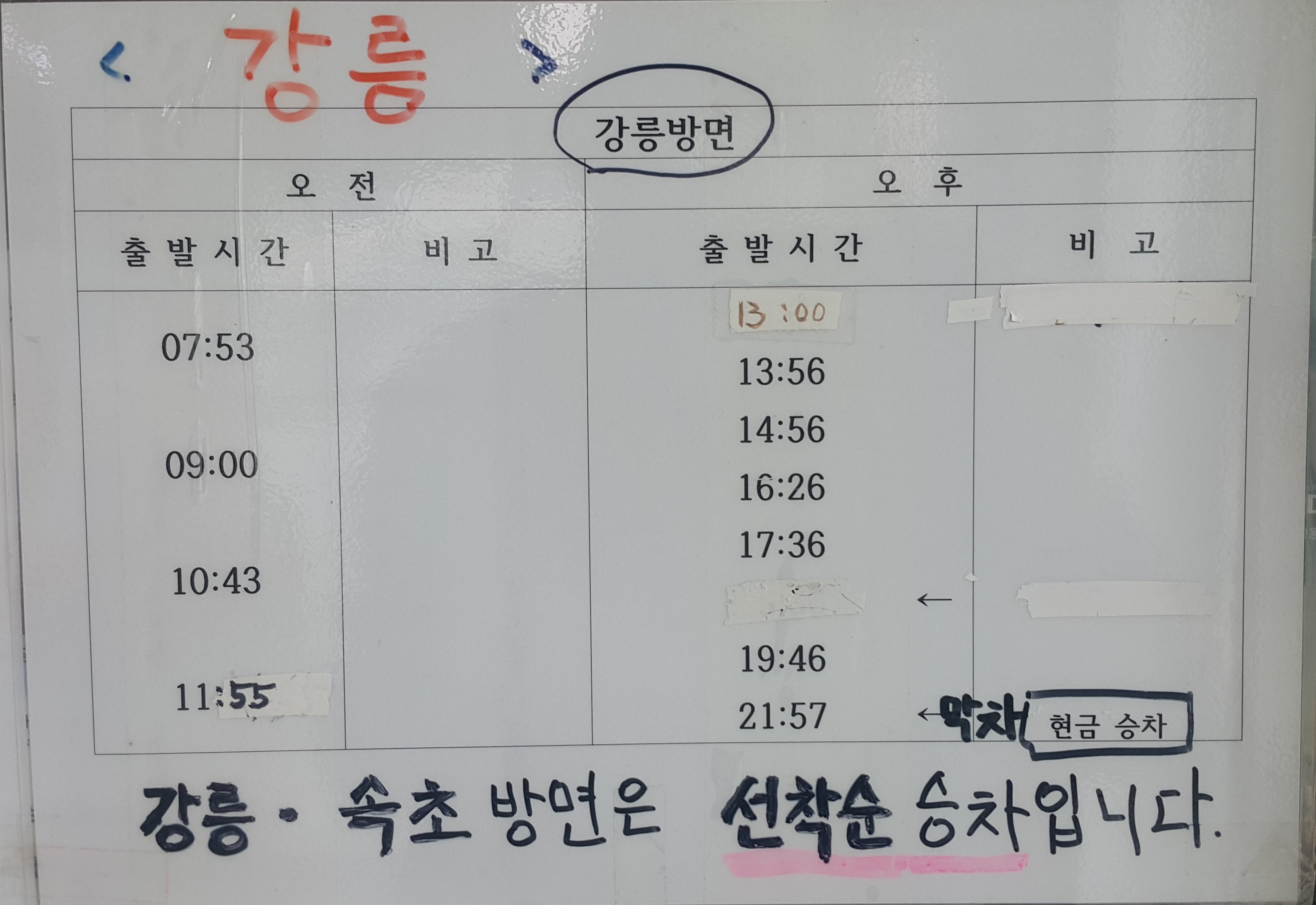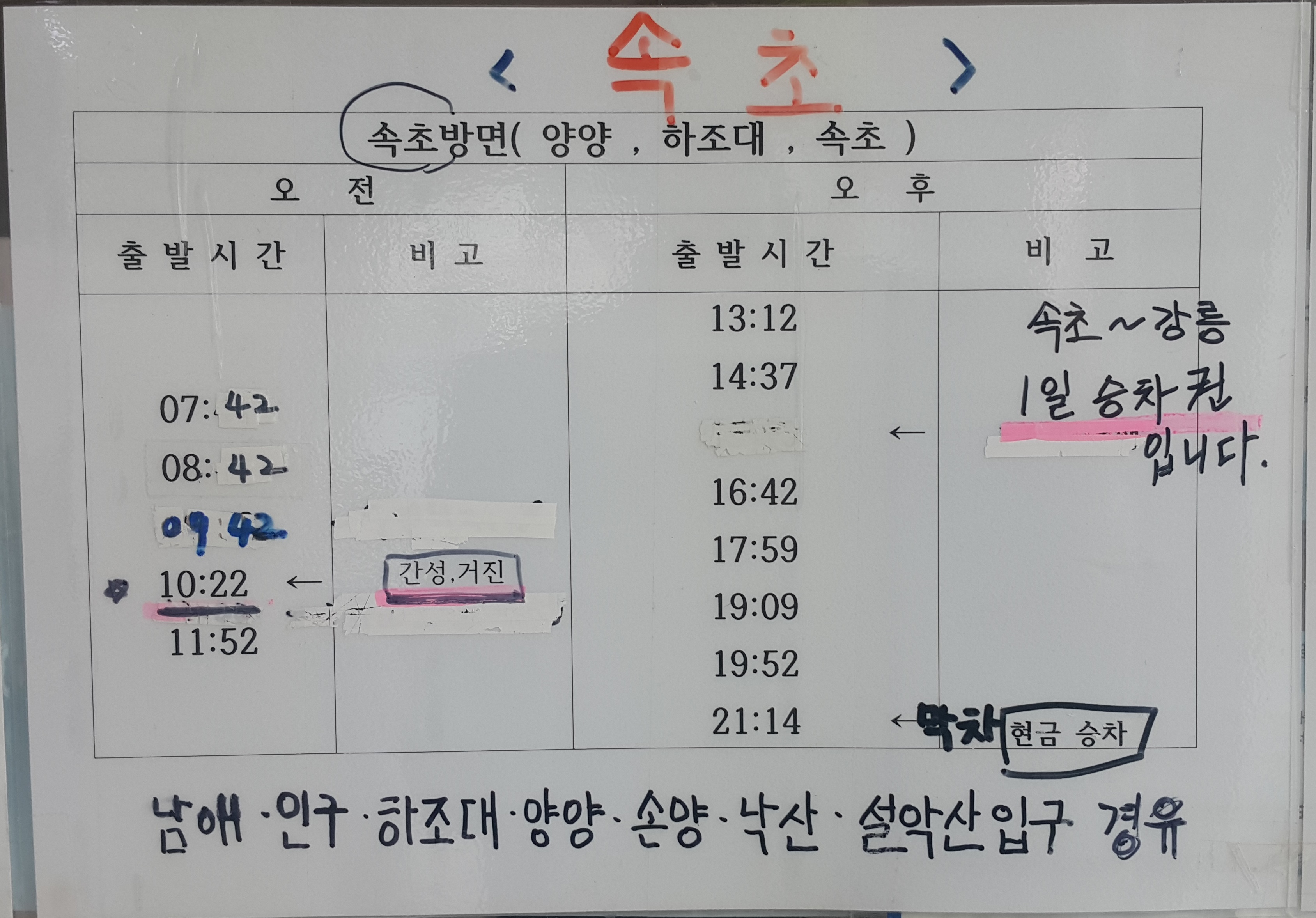 속초 방면 시간표 남애, 인구, 하조대, 양양, 손양, 낙산, 설악산 입구