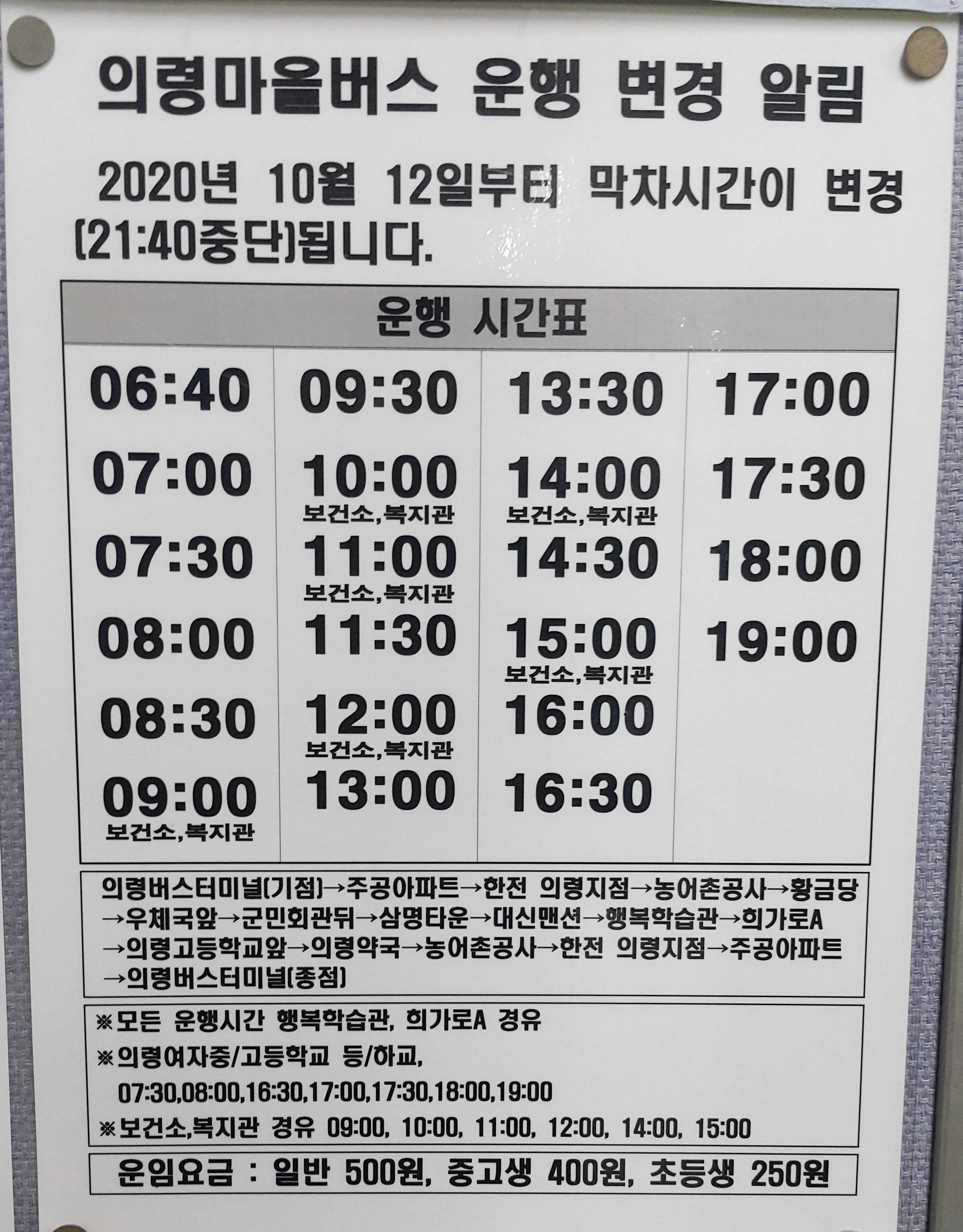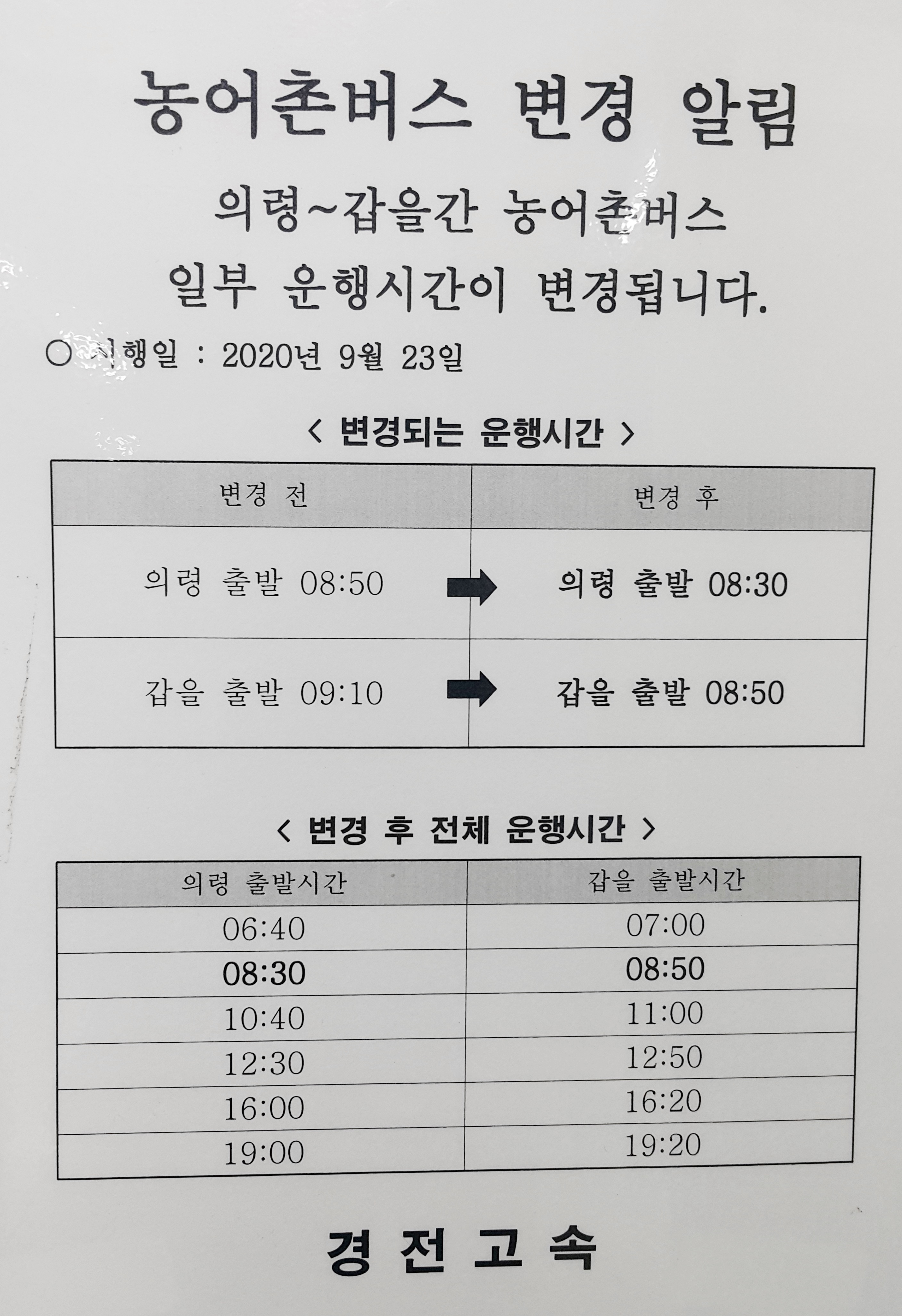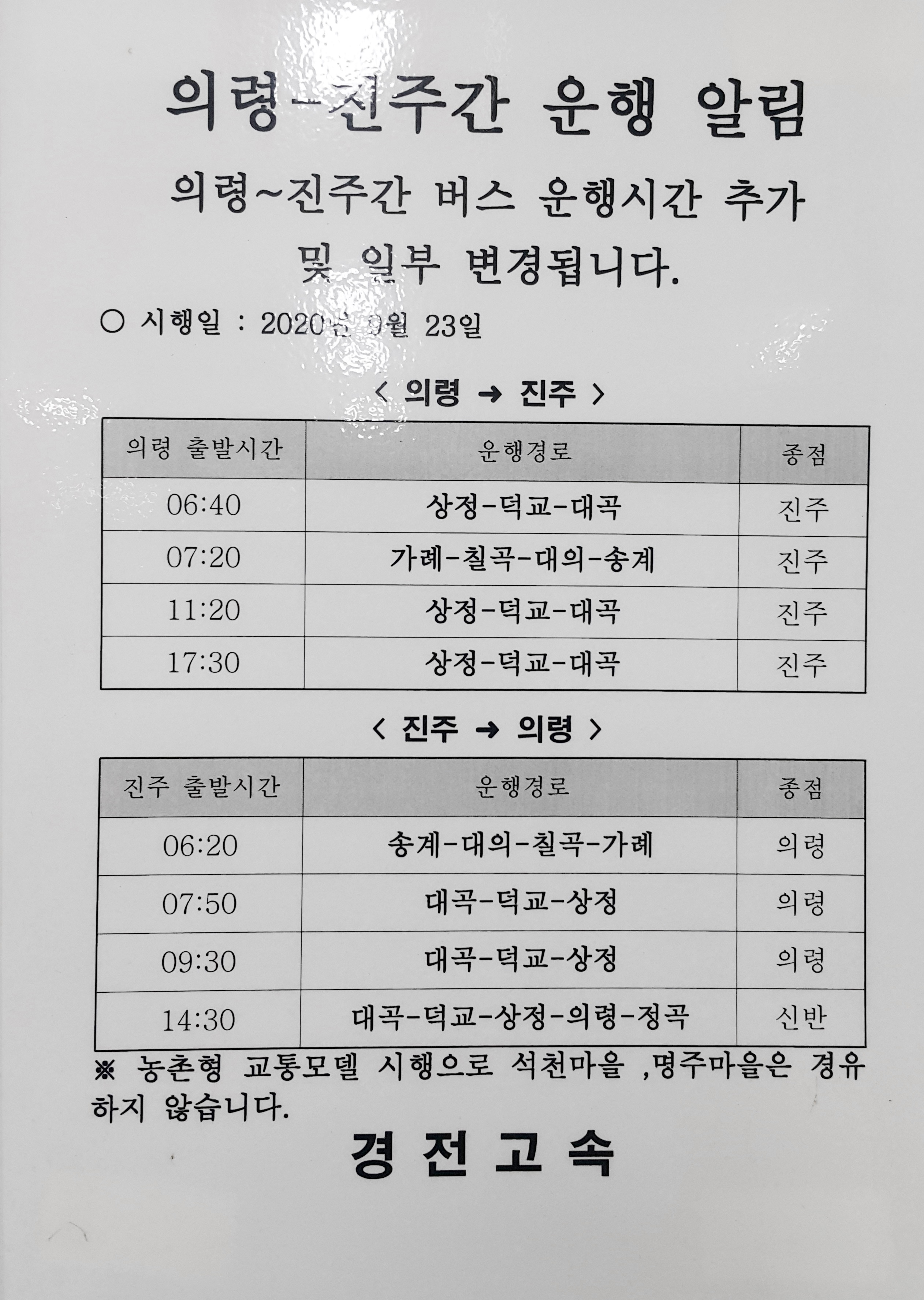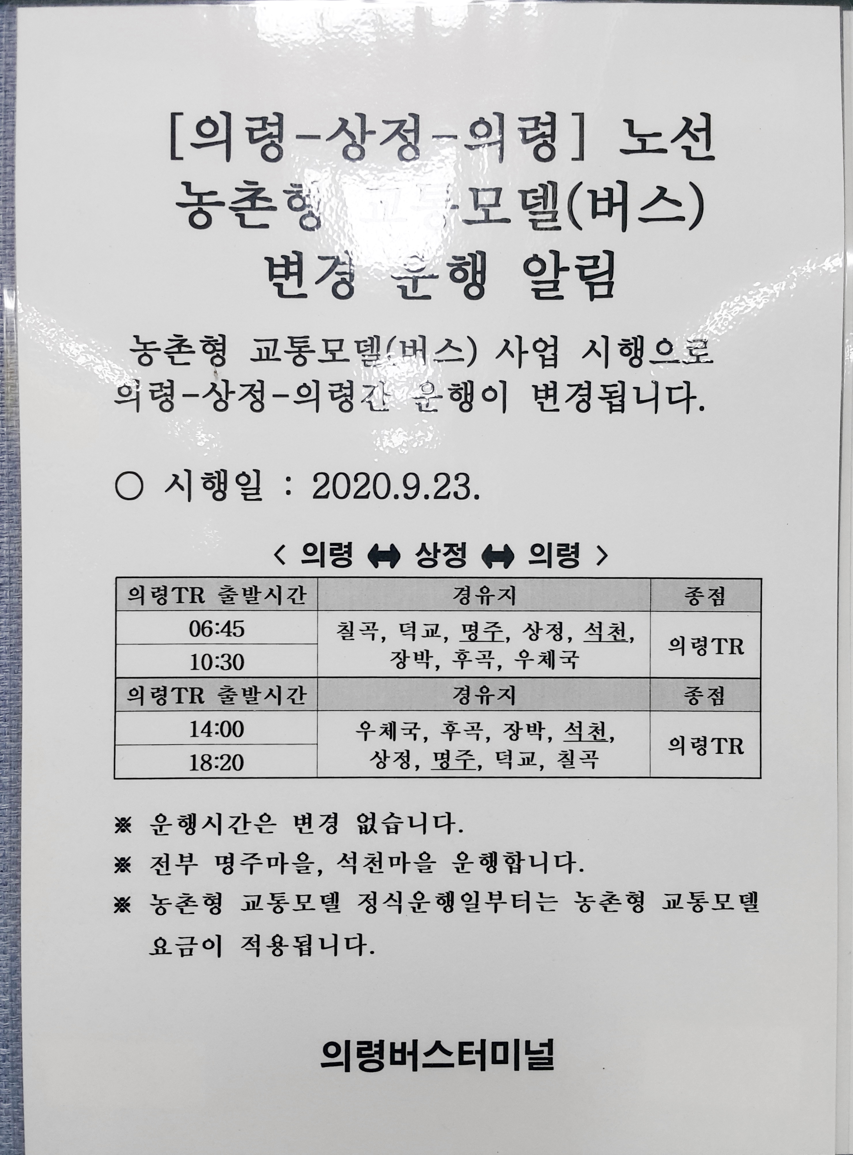 의령~상정~의령 노선 농촌형 교통 모델(버스) 변경 운행 알림