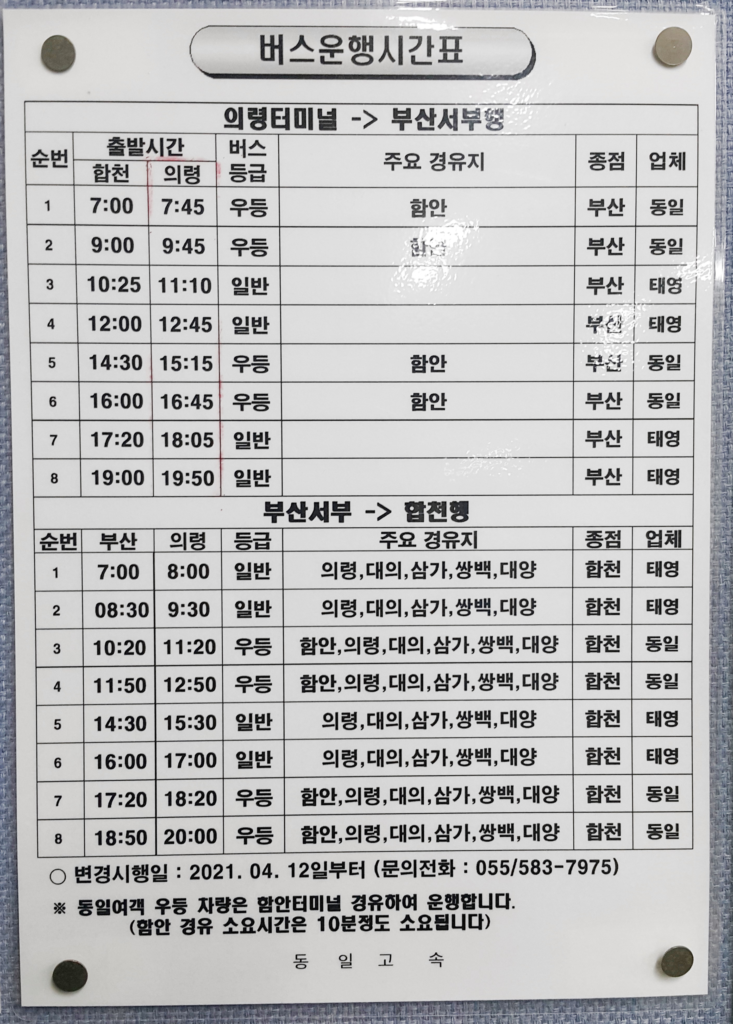 의령 출발 합천, 의령, 부산 서부 시외우등요금
