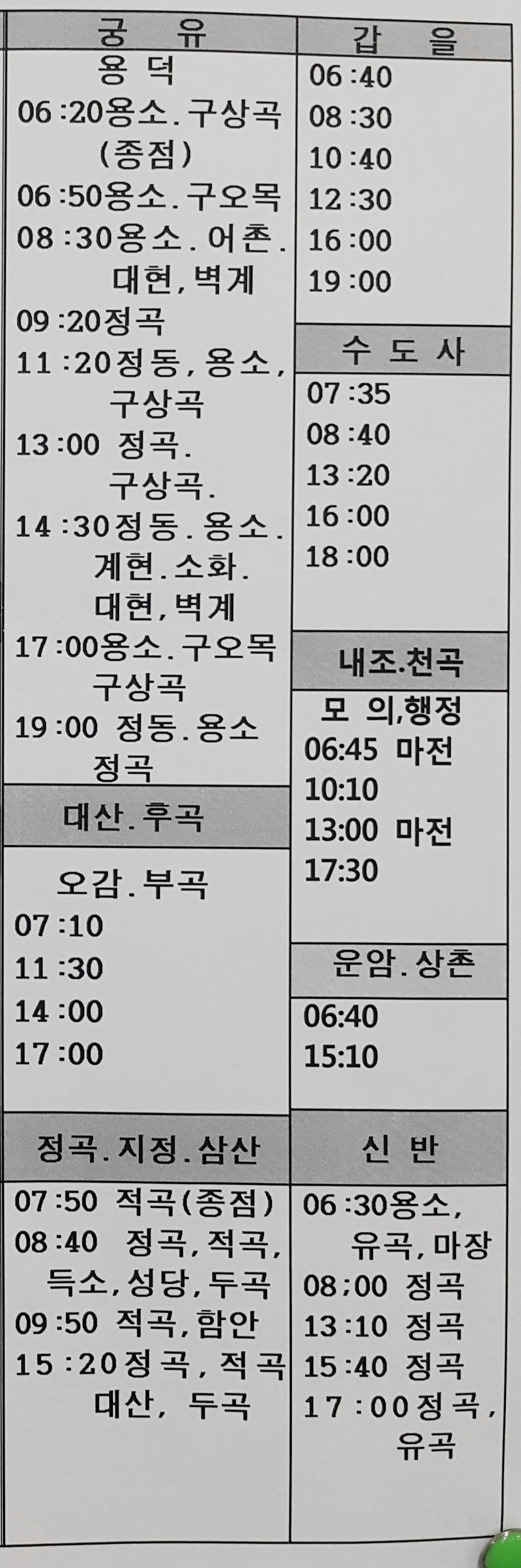 의령 출발 궁유, 갑을, 수도사, 대산, 후곡, 정곡, 지정, 삼산, 내조, 천곡, 운암, 상촌, 신반,
