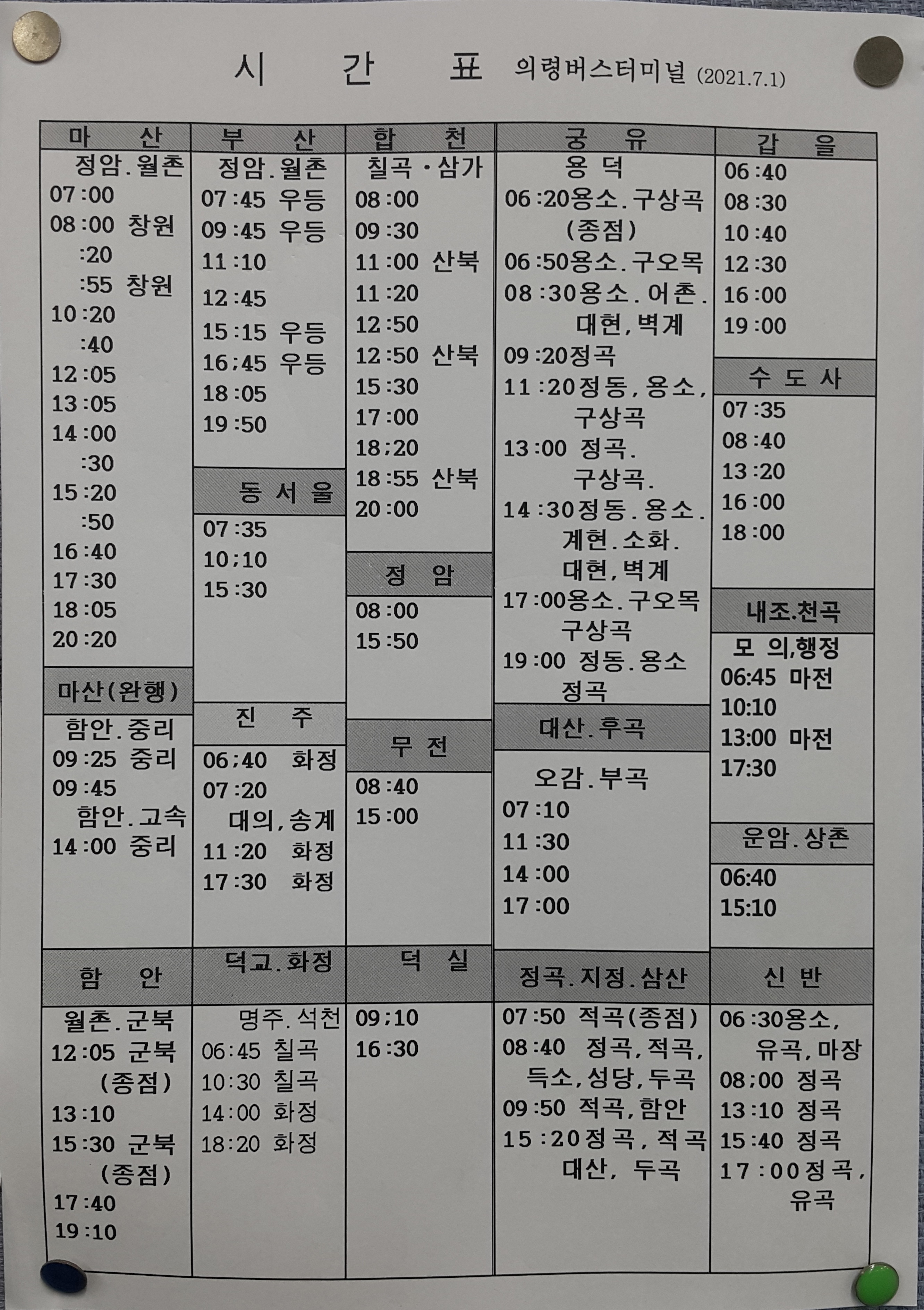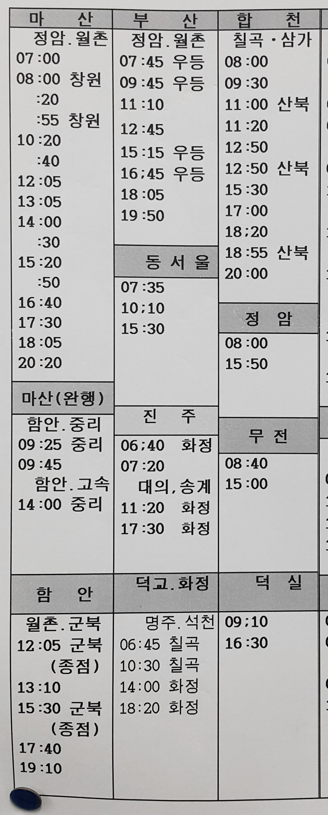 의령 출발 마산, 부산, 합천, 진주, 동서울, 무전, 정암, 함안, 덕교, 화정, 덕실 방면.