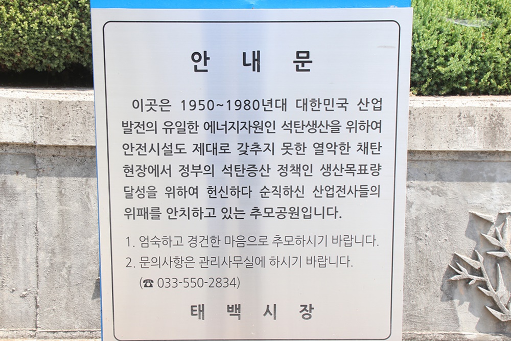 강원도의 주도로 태백시 남부로 13번지[황지동 3-3]에 제막된 태백 지역의 산업전사 위령탑과 공원은