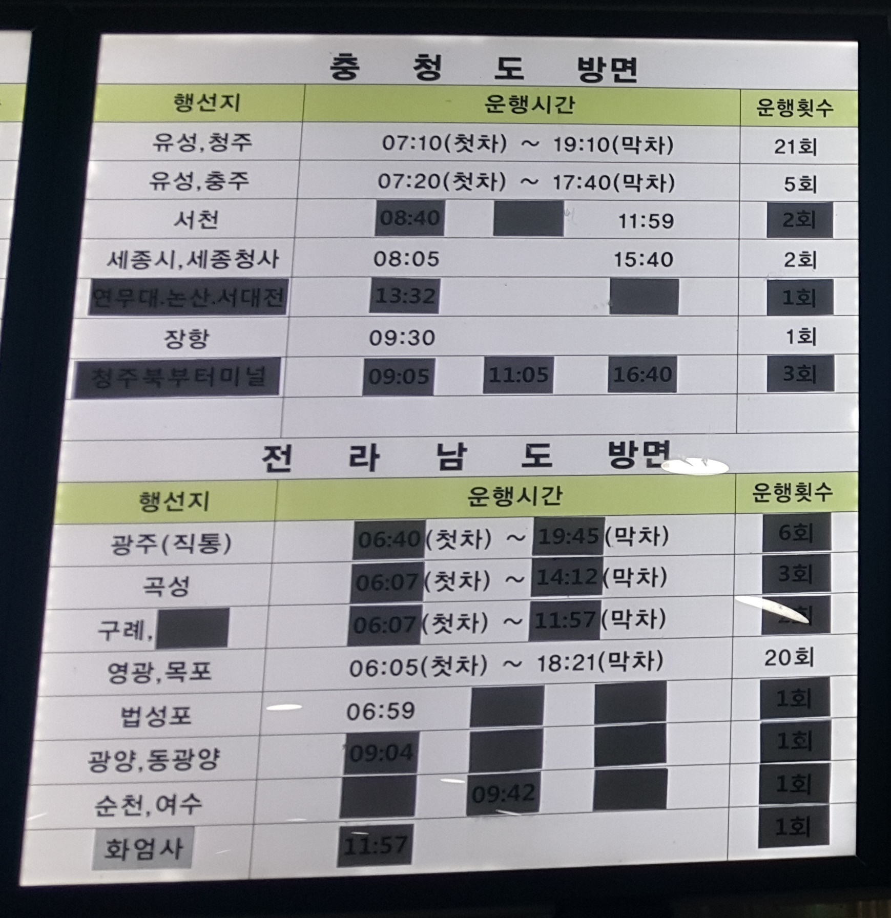 전주시외버스터미널 출발 전라남도 방면