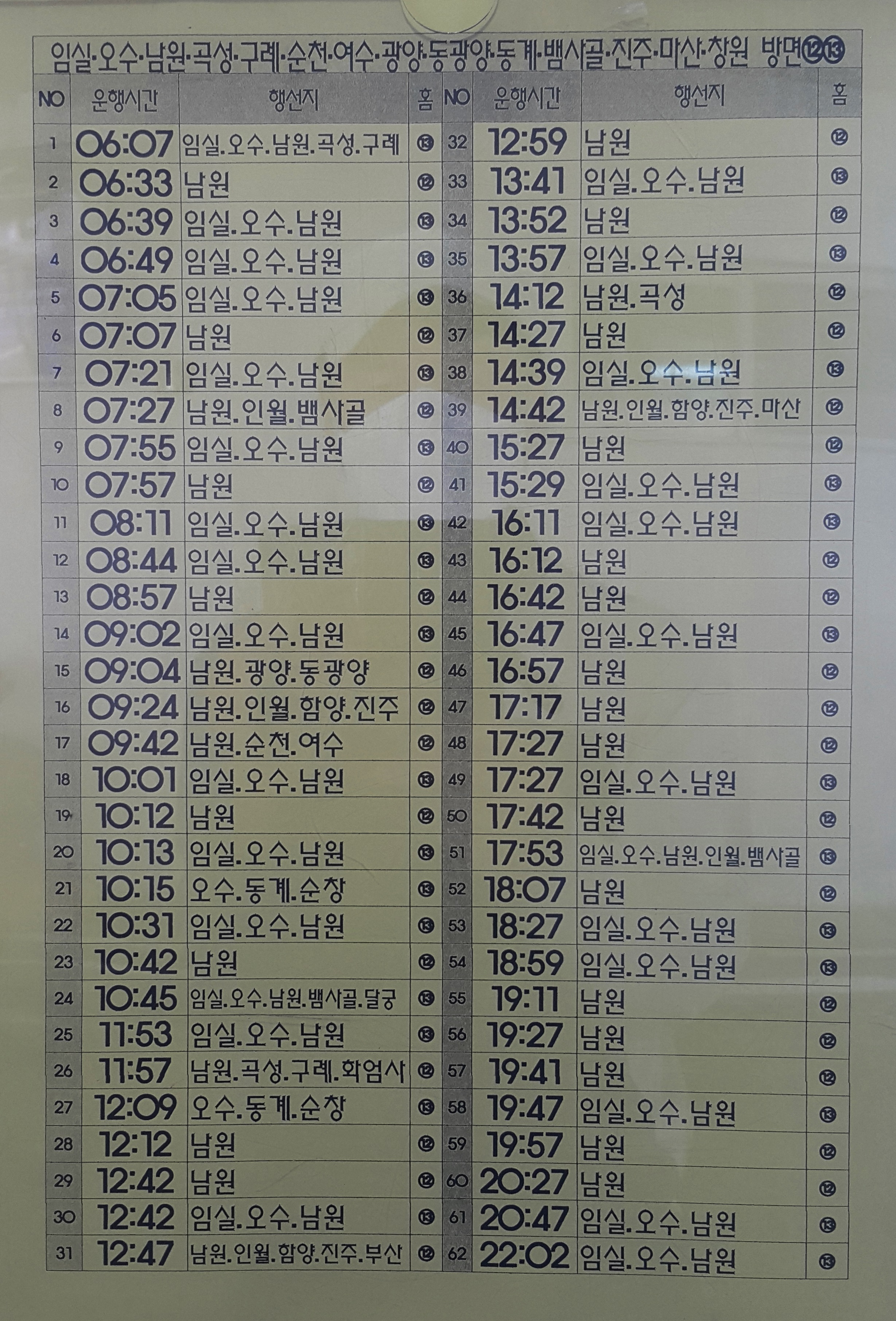 전주시외버스터미널 출발 임실, 오수, 남원, 곡성, 구례, 순천, 여수, 광양, 동광양, 동계, 뱀사골, 진주, 마산, 창원 방면.