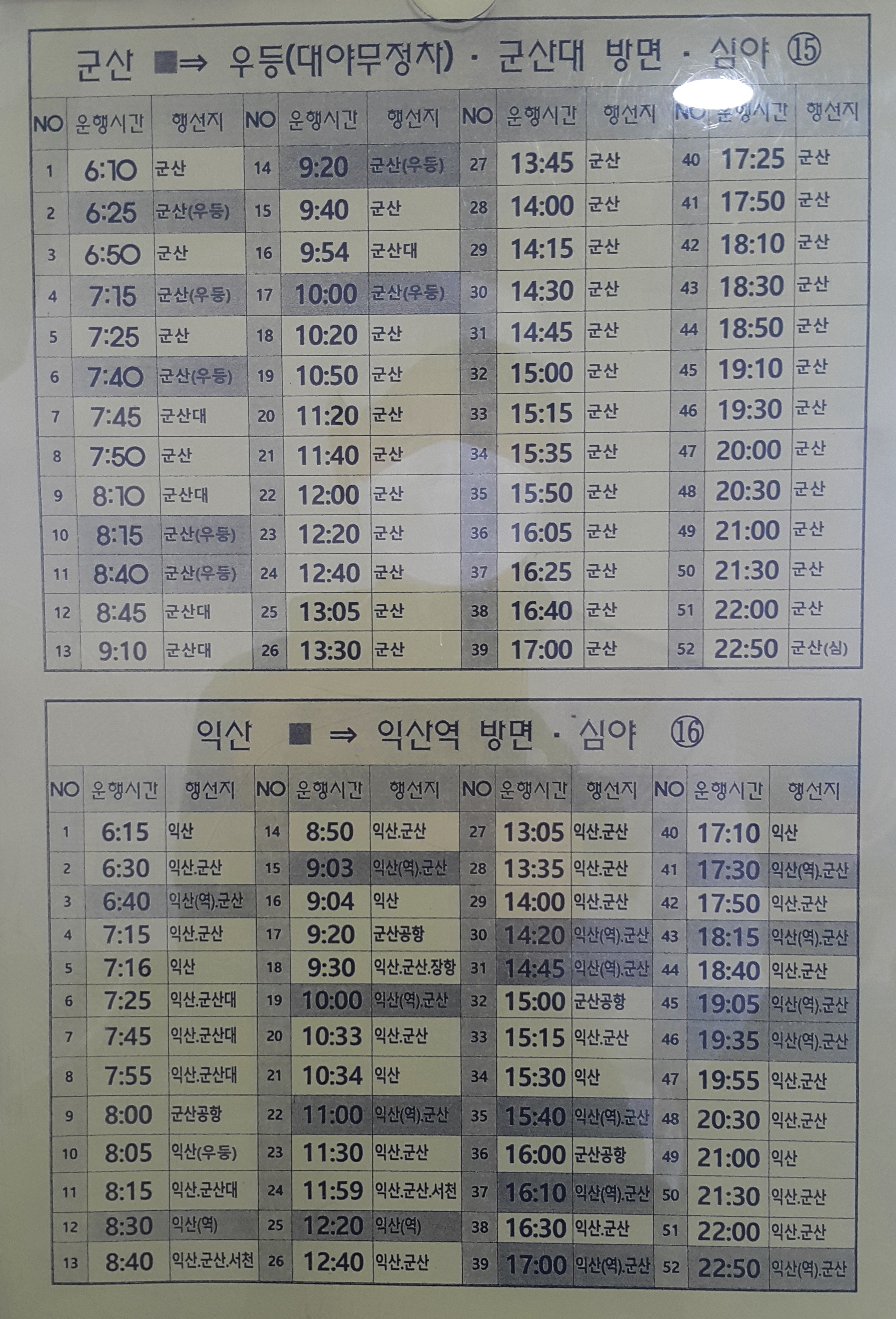전주시외버스터미널 출발 군산, 군산대, 익산, 익산역 방면 심야.