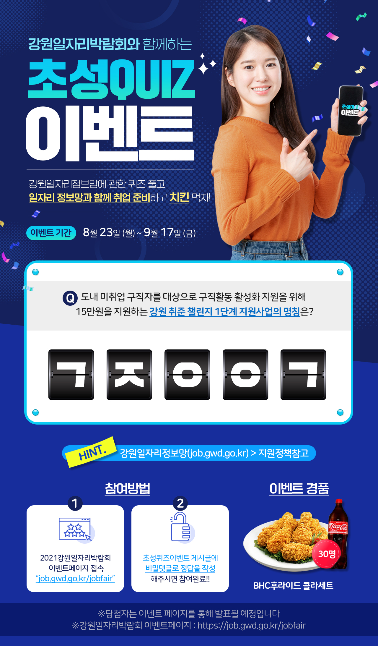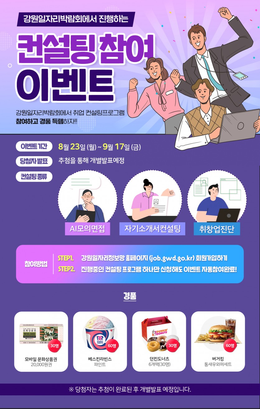 내일을 job 잡아라! 강원 일자리 박람회 강원도 모든 일자리가 한눈에! 내일도 잡고! 이벤트도 잡고! 강원일자리박람회 이벤트 페이지.