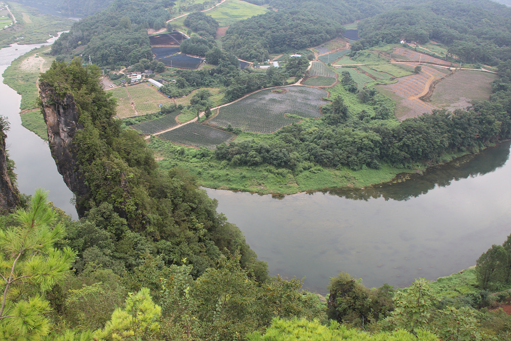 물안개 사이로 보일 듯 말듯 내려다 보이는 서강의 푸른 물줄기는