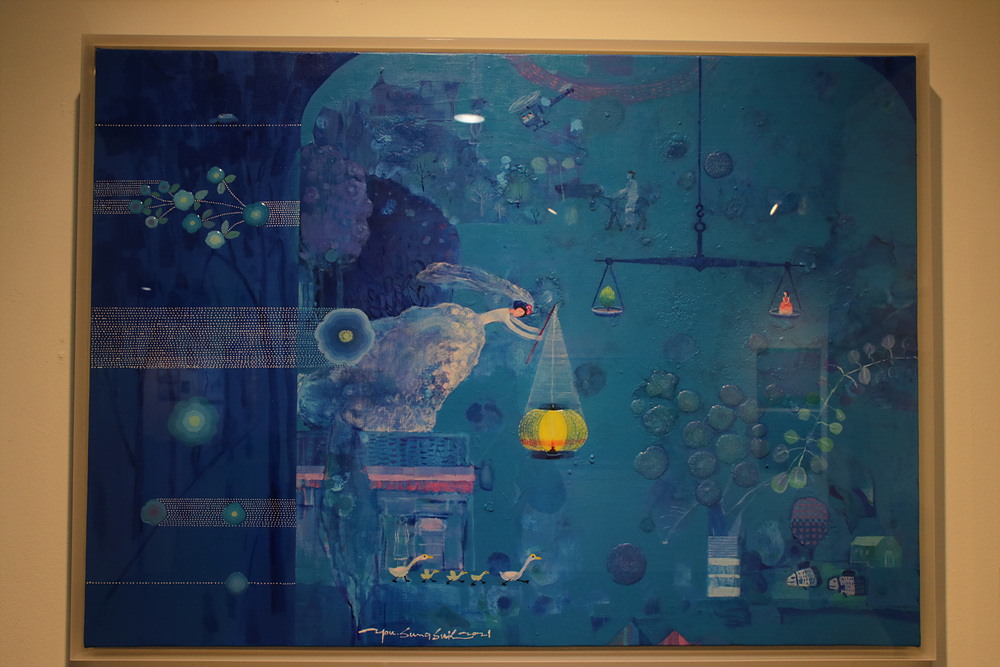 색감으로 풀어내는 여백은 캔버스 작업의 주도적 이미지 전달 매체로 작용하며, 단순함과 화려함의 조화는
