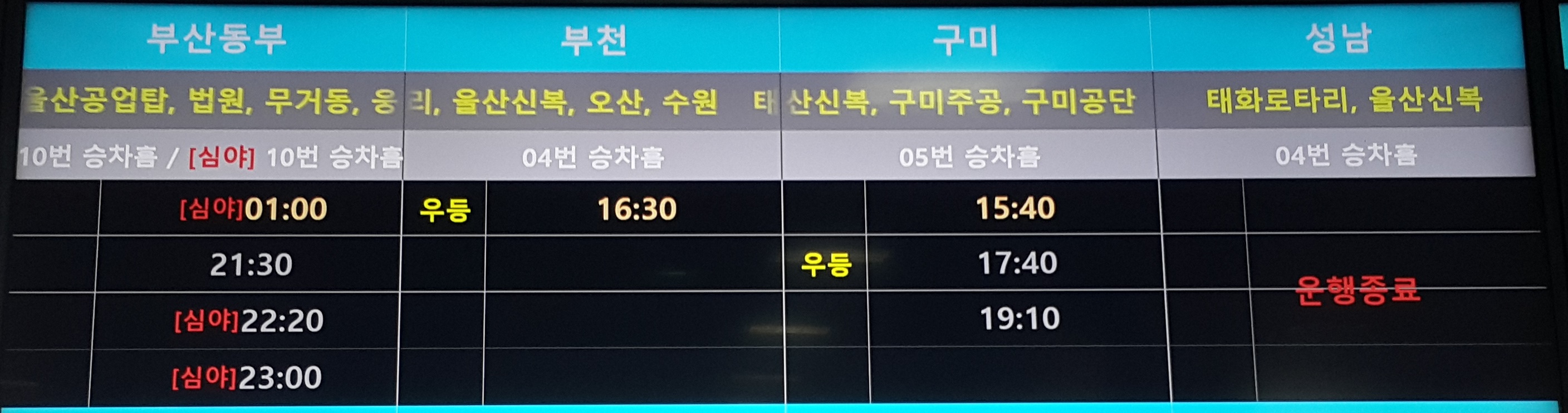 울산 출발 부산동부, 부천, 구미, 성남 방면,